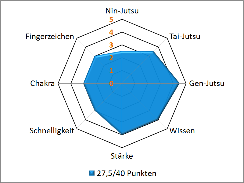 | Diagramm | Gesamt (max. 40) | Ninjutsu | Taijutsu | Genjutsu | Wissen | Stärke | Schnelligkeit | Chakra | Fingerzeichen |