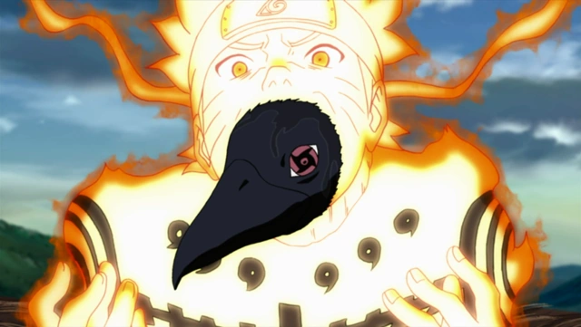 Als Itachi durch das Kuchiyose: Edo Tensei während des vierten Shinobi-Weltkrieges wiederbelebt wurde, tauchte die Krähe aus Narutos Mund auf, da Itachi von Kabuto Yakushi forciert wurde, sein Mangekyou Sharingan im Kampf gegen Naruto und Killer B zu verwenden. Da Itachi vermutete, dass Sasuke nach Itachis Tod dessen Augen für sich beansprucht, manipulierte er die Krähe so, dass diese das Kotoamatsukami verwendet, falls sie direkten Augenkontakt mit den früheren Augen Itachis hat und dadurch Sasuke manipuliert, Konoha zu beschützen. Obwohl das Kotoamatsukami gegen Itachi statt Sasuke verwendet wurde, konnte sich dieser dadurch von Kabutos Kontrolle lösen. Anschließend erklärte er Naruto seinen Plan. Da man zehn Jahre warten muss, um Shisuis Auge erneut verwenden zu können, verbrennt Itachi die Krähe, damit das Auge nicht in falsche Hände gelangen kann[3].