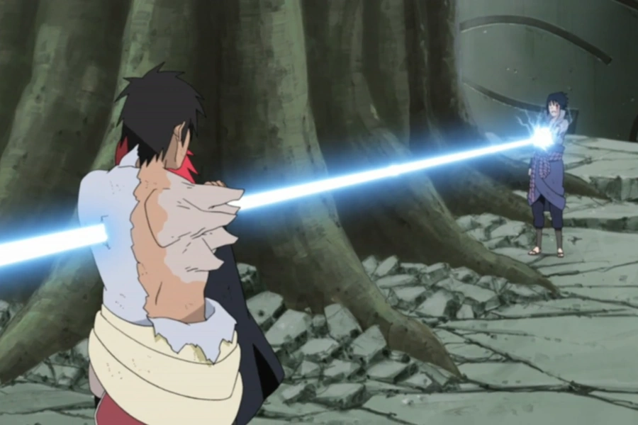 Tobi holt beide wieder aus dieser Welt heraus, nachdem er Danzou auf dem Weg zurück nach Konoha eingeholt und dessen Begleiter Fuu Yamanaka und Torune Aburame ausgeschaltet hat. Sasuke greift nun den übrig gebliebenen Danzou an. Während des Kampfes analysiert Karin ständig Danzous Bewegungen und Jutsu und schließt unter anderem ein Genjutsu, das Danzous wundersame Wiederauferstehungen erklären könnte, aus. Sie beobachtet weiterhin, dass sich immer ein Sharingan-Auge auf Danzous modifiziertem Arm schließt, nachdem dieser nach einer eigentlich tödlichen Attacke unversehrt wieder an einer anderen Stelle auftaucht. Nachdem Danzou zur Abwehr gegen einen Pfeil Susanoos allerdings ein Mokuton-Jutsu anwendet, findet sie heraus, dass Danzou sein Izanagi nur eine bestimmte Zeit lang aktiviert haben kann und entdeckt, wann und wie er es reaktiviert hat.