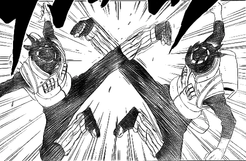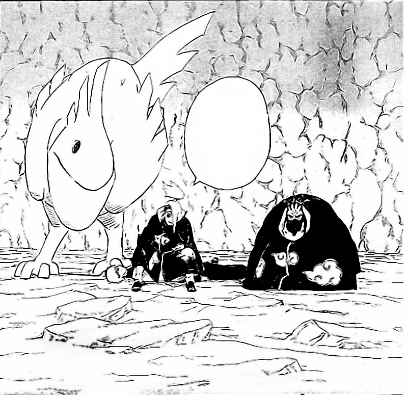 Kakashi versucht Naruto zu beruhigen, damit sie sich auf Deidara konzentrieren können, da er einen Plan hat, der sie beide involviert. Währenddessen kann Sasori nicht verstehen, weshalb sich Sakura trotz der Vergiftung bewegen kann. Als er sieht, dass sie ihre Verletzungen heilt, begreift er, dass sie ein Medizin-Ninja ist und sie vielleicht ein Gegenmittel hat. Da dies bedeuten würde, dass sie keine normale Gegnerin ist, möchte Sasori eine weitere Puppe verwenden. Er entfernt seinen Umhang und offenbart, dass sein Körper auch eine Puppe ist. Er greift Sakura an und trennt sie von Chiyo. Danach konzentriert er sich nur noch auf die wehrlose Chiyo.
