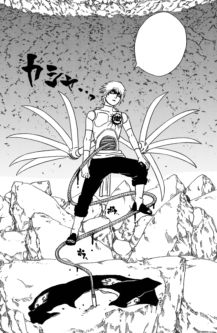 Deidara sagt Team 7, dass sie zu spät sind und Gaara tot sei. Der erzürnte Naruto greift sie an und Deidara fliegt mit Gaaras Körper weg. Naruto verfolgt ihn, um Gaaras Körper zurückzugewinnen und Kakashi begleitet ihn, nachdem er Chiyo und Sakura befielt Sasori zu beschäftigen, bis Team Gai zurückkehrt. Team Gai ist jedoch damit beschäftigt, gegen Kopien von sich selbst zu kämpfen. Sakura ist bereit mit Oma Chiyo alleine Sasori zu besiegen und sagt Chiyo, dass sie keine Angst zu haben braucht. Sasori entfernt seinen Akatsuki-Anzug und offenbart einen Skorpionähnlichen Körper bevor er erklärt, dass er sie beide töten wird.