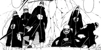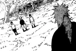 Jiraiya schafft es den Kampf zu überstehen bis Fukasaku und Shima ihr Genjutsu vorbereitet haben. Die drei Pains werden in einer Illusion gefangen und sind bewegungsunfähig. Jiraiya tötet die drei daher leicht. Überzeugt davon, dass er gewonnen hat, dankt er Fukasaku und Shima für ihre Hilfe bei der Eliminierung von Pain. Jedoch erscheint eine neue Person mit dem Rin'negan und greift Jiraiya an. Dieser verliert dabei einen Arm und die sechs Pfade des Pain erscheinen. Unter ihnen befinden sich die drei zuvor getöteten und alle besitzen das Rin'negan.