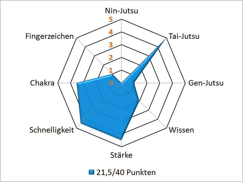 | Diagramm | Gesamt (max. 40) | Ninjutsu | Taijutsu | Genjutsu | Wissen | Stärke | Schnelligkeit | Chakra | Fingerzeichen |