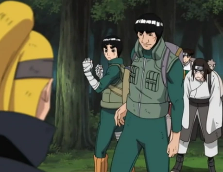 Lee und seinen Kameraden gelingt es nach einem harten Kampf, ihre Doppelgänger zu besiegen und sie machen sich abermals auf die Suche nach Team Kakashi, um ihnen zu helfen. Dabei treffen sie auf Deidara, der sich vor Kakashi und Naruto versteckt hält. Gais Team schafft es, Deidaras Flucht zu stoppen, doch schnell erkennt Neji, dass Deidara plant, sich selbst in die Luft zu jagen, doch seine Warnung kommt zu spät. Kakashi hat aber gerade noch genug Zeit, um die Explosion Deidaras mit seinem Mangekyou Sharingan in eine andere Dimension zu versetzen.