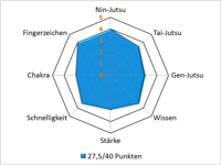 | Diagramm | Gesamt (max. 40) | Ninjutsu | Taijutsu | Genjutsu | Wissen | Stärke | Schnelligkeit | Chakra | Fingerzeichen | Yin und Yang |