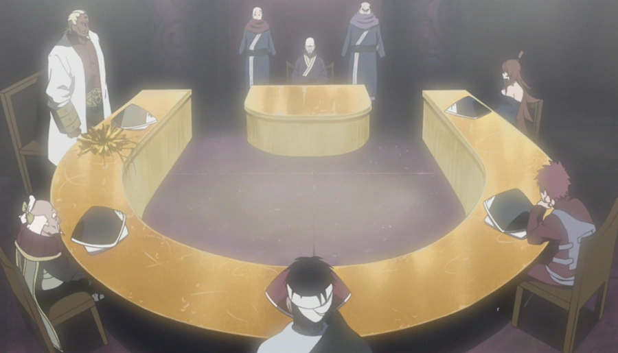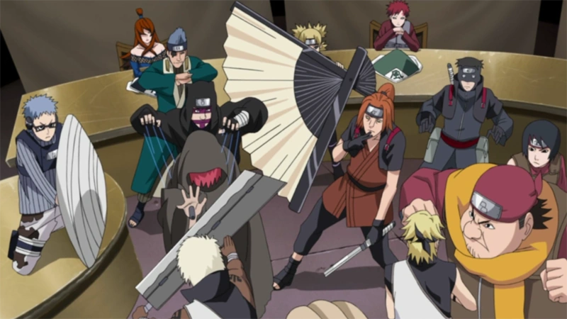 Der Raikage ist strikt dagegen, Danzou zum Oberhaupt der Allianz zu machen und schlägt sich selbst vor, da er der einzige sei, der keine dubiosen Beziehungen zu Akatsuki habe. Mifune antwortet darauf, dass sie jemanden, der sich von seinen Emotionen so schnell überrumpeln lässt, sodass er bei einem wichtigen Teffen sogar einen Tisch zertrümmert, nicht als Anführer der Allianz gebrauchen können; Gaara wäre zu jung für diese Herausforderung; Oonoki hätte schon zu oft Akatsuki benutzt und er sei zu alt; und da in Mei Terumiis Dorf Kirigakure Akatsuki entstanden sein soll, sei sie am wenigsten vertrauenswürdig. Also wäre Danzou der einzige, der in Frage käme, da der letzte Jinchuuriki ebenfalls aus Konoha ist.