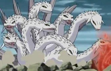 -La técnica más poderosa de Orochimaru es la llamada “Ocho Franjas”, una transformación radical en un dragón gigantesco de 8 cabezas, aún más grande que la propia Manda.