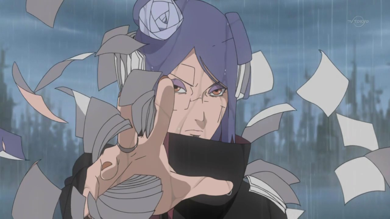 </p><p>Durante su encuentro contra Obito, Konan lanzó un puñado de Shurikens de Papel, luego creo sus alas de papel para lanzarse contra Obito, posteriormente recibió parte de su propia explosión perdiendo gran parte de sus papeles, después abrió el océano mediante a controlar 600 billones de sellos explosivos los cuales estuvo dirigiendo y activando hacia Obito durante 10 Minutos, posterior a ello fue apuñalada en el abdomen, pese a esto, siguió en condiciones de formar el Chakram de Papel.