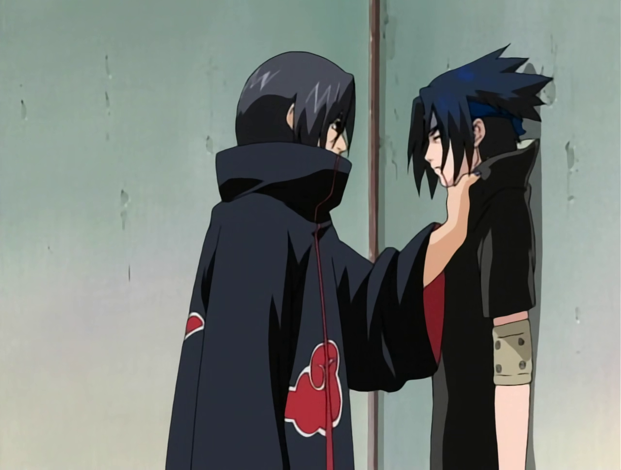 Itachi lo levantó por el cuello a Sasuke y lo golpeó contra la pared. Luego comentó que Sasuke era demasiado débil, y carecía de odio que se necesita para derrotarlo. Se inclinó hacia delante para susurrar al oído de su hermano Sasuke que nunca tendrá suficiente odio.