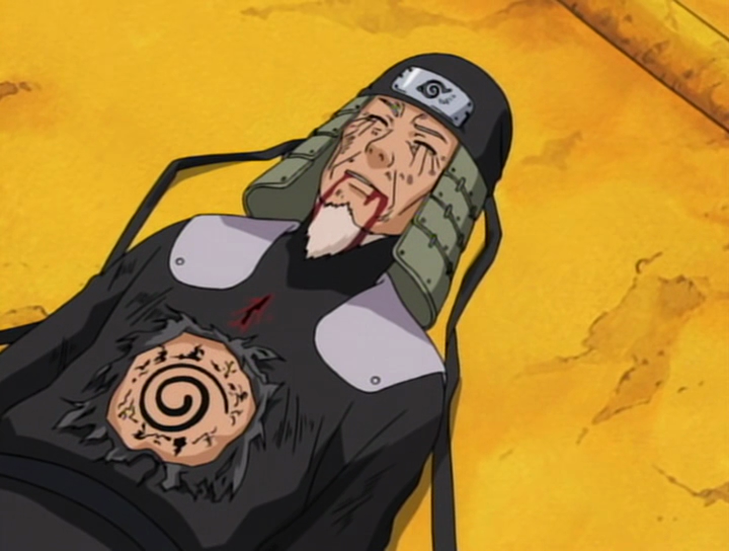 Malgré une blessure mortelle infligée par l'Épée de Kusanagi, Hiruzen continuait d'extraire l'âme d'Orochimaru de son corps, sachant que la mort l'attendait au bout du chemin quoi qu'il arrive. Malheureusement, la faiblesse du vieillard due à son âge lui fit comprendre qu'il ne parviendrait pas à achever son œuvre. Tentant néanmoins de corriger ses erreurs du passé, Hiruzen scella les bras d'Orochimaru, pour s'assurer qu'il ne puisse jamais plus utiliser le ninjutsu, un châtiment adapté à l'obsession d'Orochimaru pour le pouvoir. Alors qu'Orochimaru maudissait son maître, celui-ci lui fit ses adieux, espérant qu'ils se retrouveraient dans l'au-delà. Le village étant sauvé pour la nouvelle génération, Hiruzen mourut le sourire aux lèvres, protégeant le village comme un grand Hokage.