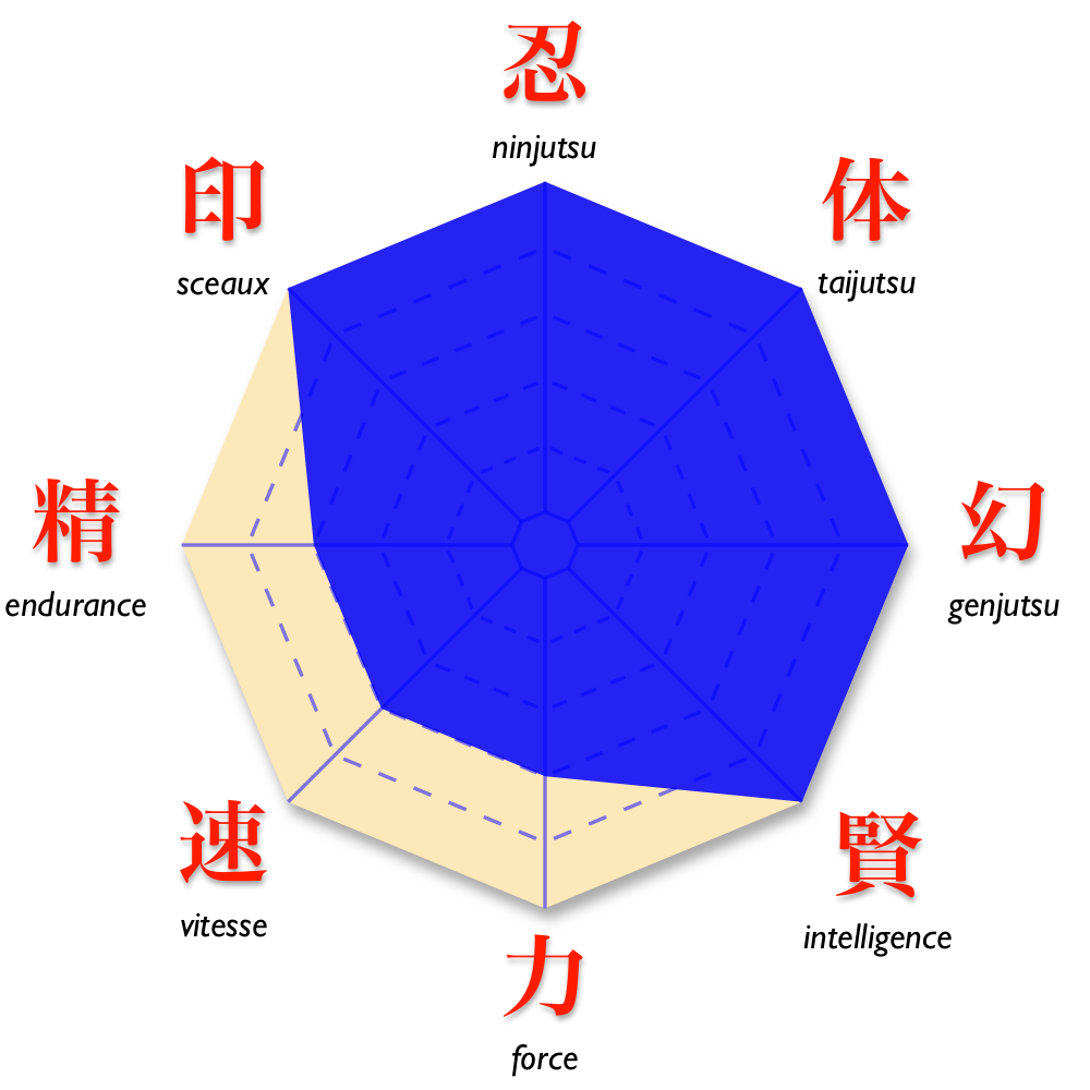 | Databook | Ninjutsu | Taijutsu | Genjutsu | Intelligence | Force | Vitesse | Endurance | Sceaux | Total |