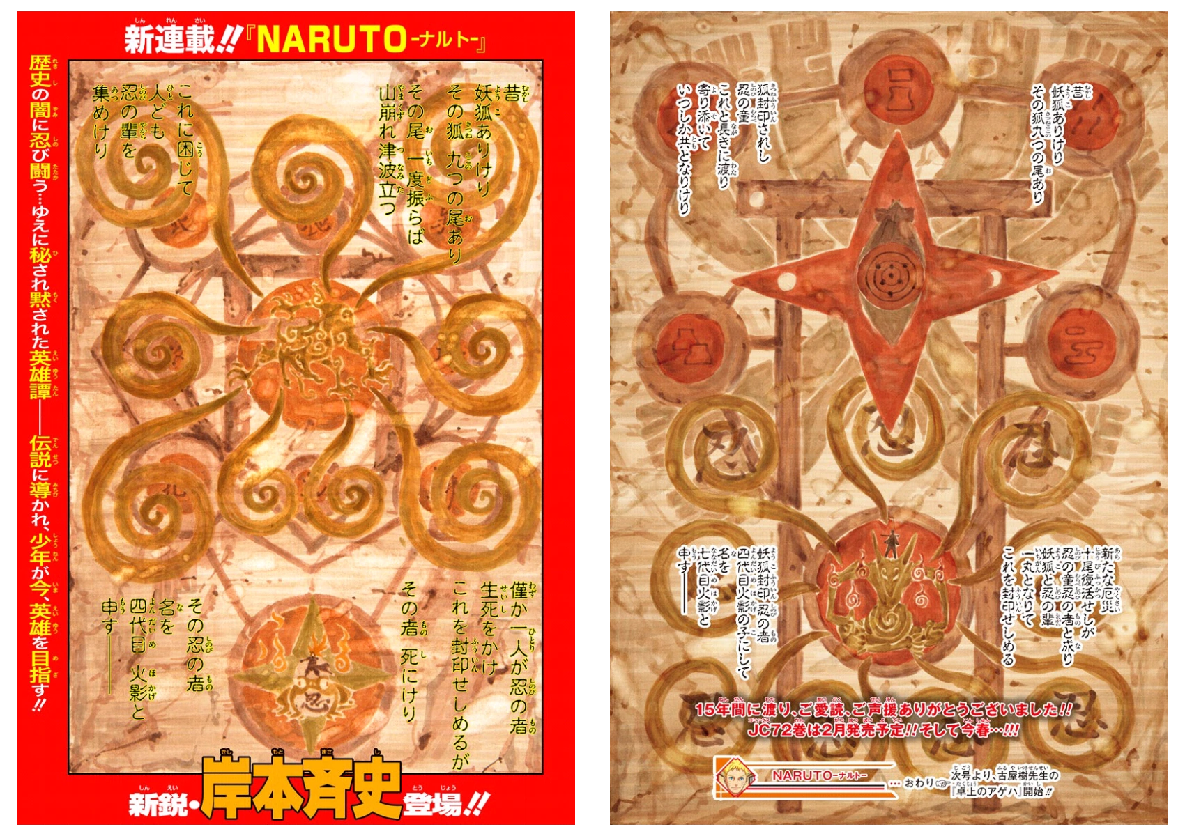 - La page finale du chapitre reflète la première page de la série, la première racontant l'histoire de Kurama et comment il fut scellé en Naruto et la dernière racontant l'histoire de Naruto, quelle fut sa vie et comment il devint le Septième Hokage.