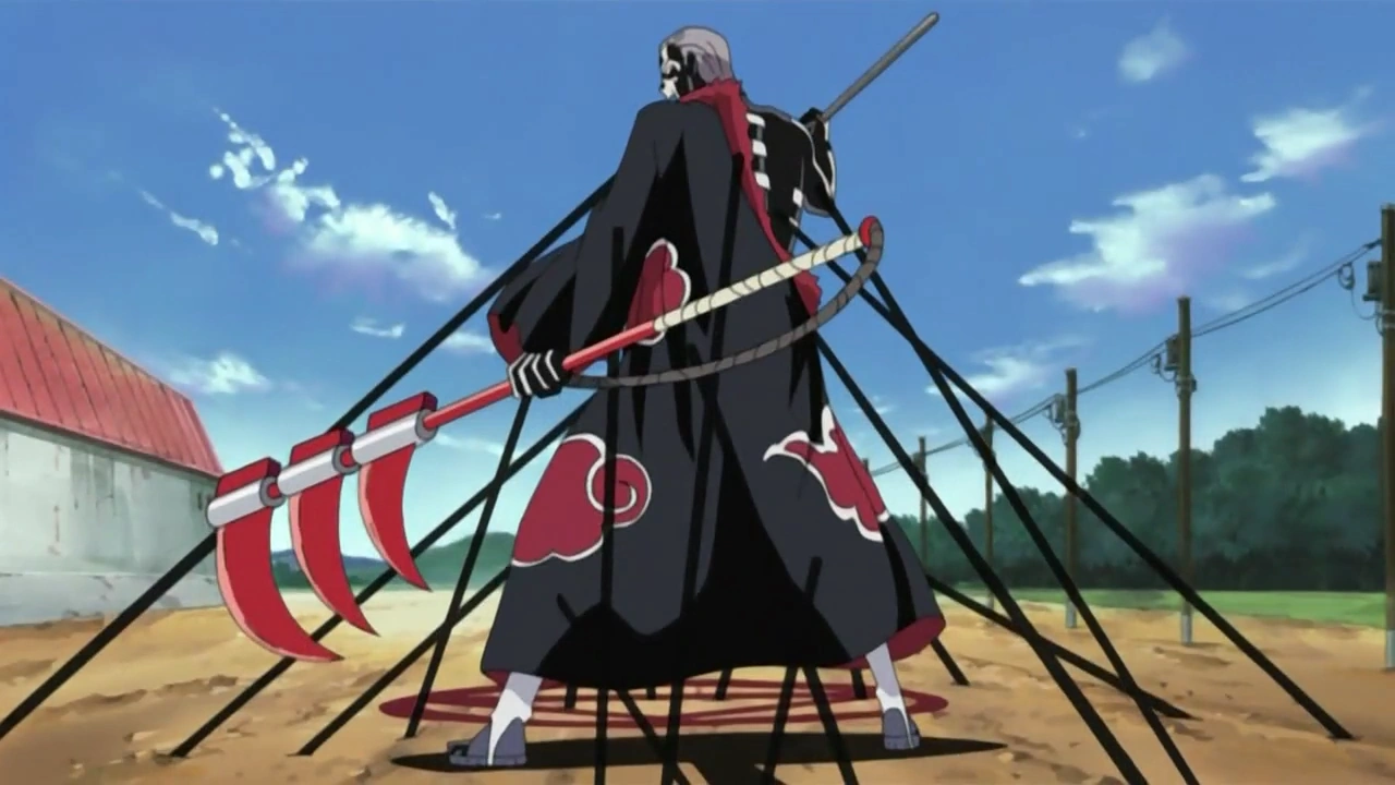 Shikamaru utilisant son Entrelacement des Ombres pour immobiliser Hidan.