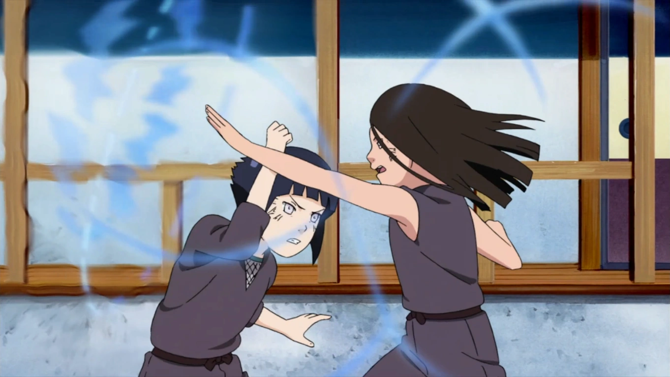 Dalam anime, diperlihatkan bahwa dia sangat terampil dalam taijutsu bahkan pada usia muda, karena ia mampu mengalahkan Hinata dalam duel perdebatan menggunakan Jūken gaya bertarung klan-nya dengan kelincahan yang bagus; Namun, bagian dari kemenangan ini berasal dari keengganan Hinata untuk menyakiti adiknya. Tidak hanya itu, pada usia 10 tahun, ia mulai belajar Tapak Delapan Trigram Mengitari Surga.[3]