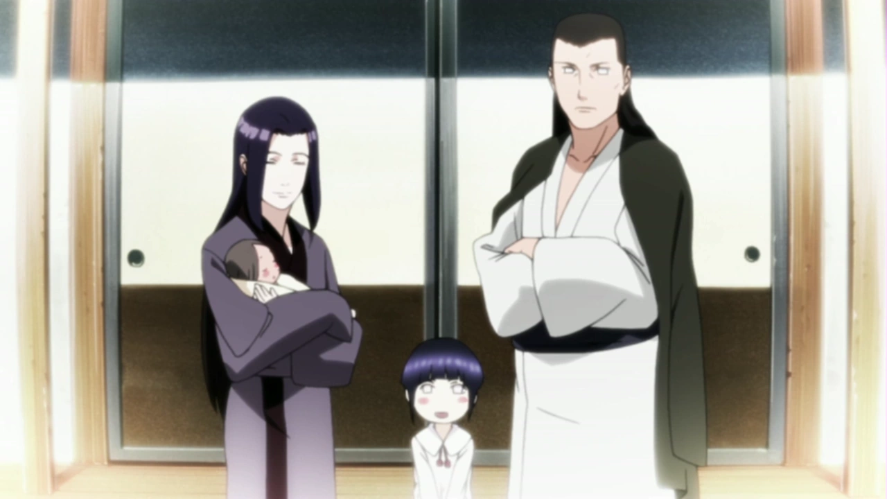 - Sebagai saudara paling muda, ada kemungkinan dia akan ditempatkan di Keluarga Cabang dan menerima segel kutukan, setelah ahli waris berubah menjadi tiga. Namun, karena ayahnya merasa bahwa Hanabi adalah ahli waris yang lebih cocok daripada Hinata, dan karena ada beberapa perubahan dalam cara keluarga Hyūga bekerja, ia terbebaskan dari masalah ini. Karena dia adalah seorang gadis, namun, mungkin juga dia tidak pernah dimaksudkan untuk memiliki segel terkutuk sejak awal, karena tradisi Jepang biasanya hanya memungkinkan laki-laki yang masuk ke dalam keluarga cabang.