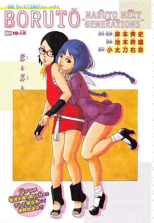 Sumire nota che Akita ha preso in simpatia Boruto, e chiede a Sarada se Boruto è popolare con le ragazze. Sarada pensa che Boruto faccia amicizia facilmente. Sumire chiede se Sarada è interessata a Boruto. Sarada nega, e Sumire rivela che lo è. Salutano Akita e Sumire e partono. Sul luogo dell'incidente, notano delle marionette meccaniche sparse tutt'intorno, e si chiedono se ci sia stata una battaglia. Non vedono alcuna traccia di Konohamaru. Il dirigibile precipitato attira l'attenzione di Katasuke, che entra per indagare, trovando la scatola vuota. Fuori, le marionette si attivano e attaccano.
