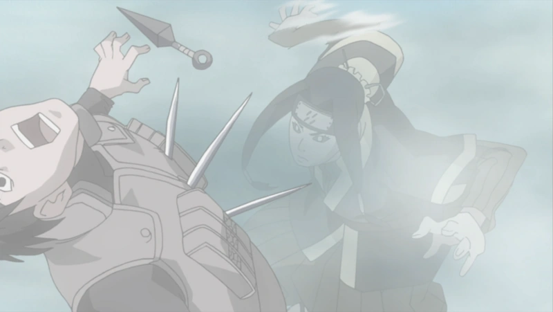 Podczas drugiej walki Zabuzy z Kakashim, Haku (posiadając tę samą maskę jak wtedy, gdy ocalił Zabuzę), został wysłany do walki z uczniami Kakashiego: najpierw Sasuke, a potem Naruto. Uwięził obydwóch w Demonicznych Kryształowych Lustrach Lodu i strzelał do nich igłami, męcząc ich. Kiedy wydawało się, że Sasuke umiera chroniąc od "krytycznego" trafienia (w rzeczywistości miał tylko zostać wprowadzony w stan śmierci przez Haku), Naruto, w gniewie, wykorzystuje moc Dziewięcioogoniastego Lisiego Demona zapieczętowanego w nim. Był w stanie zaatakować Haku i przebić się przez lustra, po czym zrywając maskę Haku. Poznając Haku z wcześniejszego spotkania, Naruto odzyskuje przytomność w czasie, by powstrzymać się od zabicia Haku.