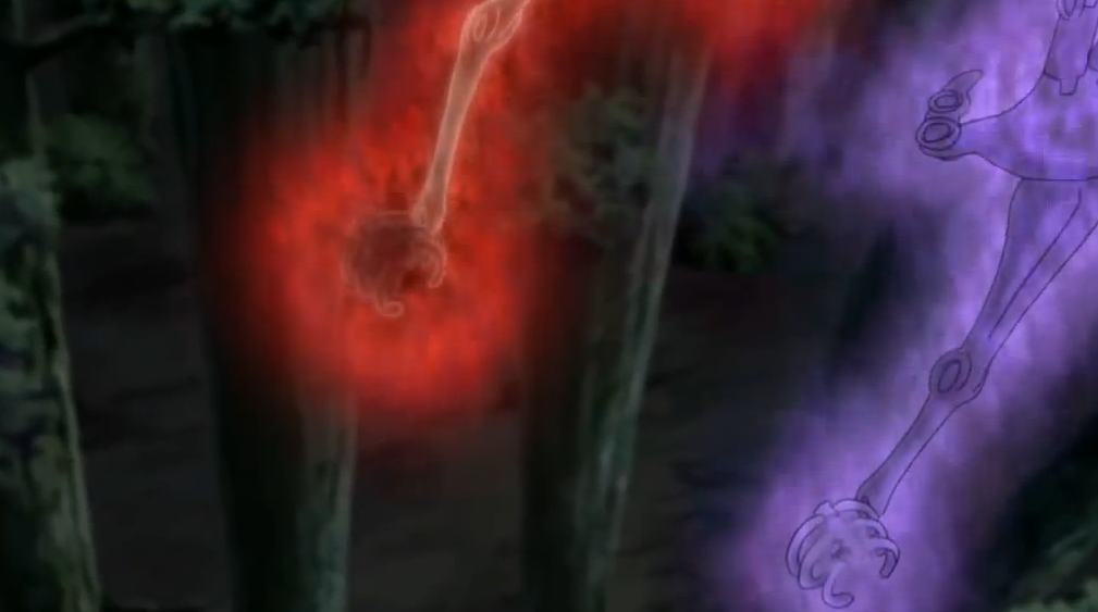 Uzumaki postanawia walczyć z napastnikami, jednak w skumulowaniu czakry przeszkadza mu Samehada — miecz „potwora z Kirigakure”. Gdy sytuacja wydaje się beznadziejna na scenę wkracza Jiraiya, lecz zatrzymuje go Sasuke, który zamierza dopełnić swej zemsty. Itachi więzi go w genjutsu i wyjawia, iż powodem dla którego jest on zbyt słaby, by móc mu zagrozić- jest brak nienawiści w jego sercu.