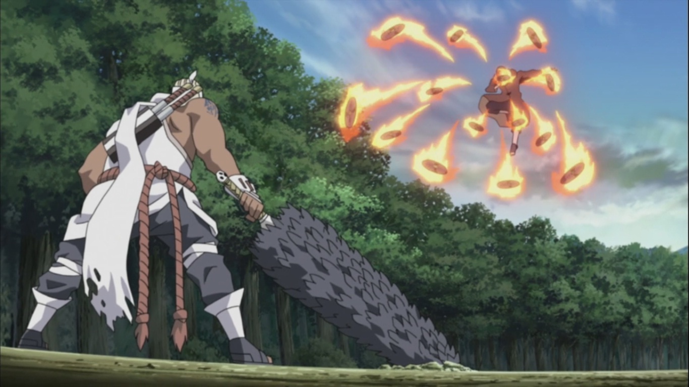 Itachi obtacza ogniem swoje shurikeny.