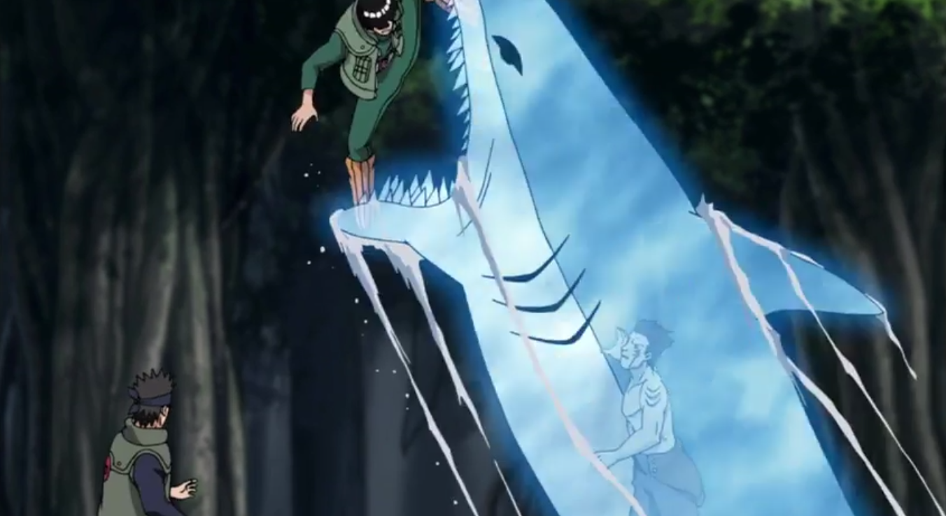 wszelkich innych informacji. Guy pokazał szacunek przysięgając, że będzie pamiętał o nim przez resztę jego życia i próbuje przeglądnąć zwój, chcąc sprawdzić informacje zebrane od Kisame. Nieoczekiwanie, zwój miał pułapkę w nim, dzięki czemu wszyscy zostali uwięzieni wewnątrz Wodnego Więzienia, z rekinami wewnątrz, a jeden z nich wyrywa zwój i ucieka z nim.