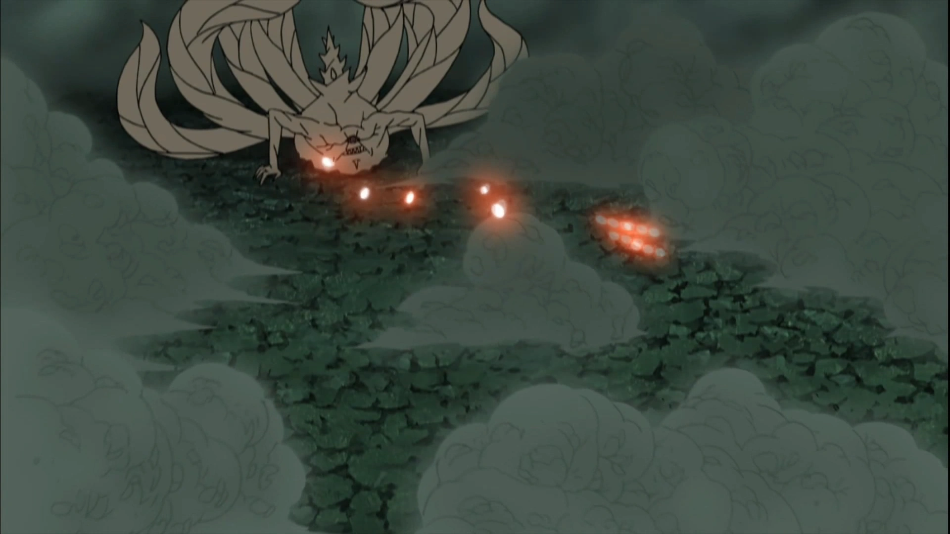 Dez-Caudas: Bomba Bijuu Convergida (十尾・集厄尾獣玉, Juubi: Shuuyakuo Bijuudama)[31] — Utilizada exclusivamente pelo Dez-Caudas em sua forma final, essa variante da Bomba Bijuu passa por um processo de Mudança da Forma antes de ser usada, assumindo aparência cônica. A bomba pode ser disparada para atingir alvos à quilômetros de distância e o raio de sua explosão supera a versões usadas pelas outras Bijuu, de modo que seus efeitos podem ser visualizados do outro lado do continente. Seu poder destrutivo é tão elevado que pode destruir vilas e cordilheiras inteiras.[32]
