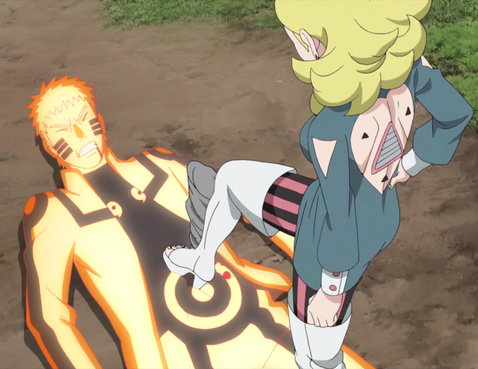 Delta repreende Kawaki por danificar seu corpo, que como "Receptáculo", ela considera pertencer a Kara e Jigen. Ela acredita que Amado seria capaz de curar o dano. Naruto, enfurecido, continua a luta com Delta, os dois trocam golpes até que ela atinja o chão. Quando ele se aproxima, Delta tenta finalizar a luta disparando à queima-roupa com o Feixe de Luz da Destruição, mas ele o dispersa com um Rasengan Gigante. Delta absorve, e Naruto faz um Rasengan ainda maior, a ponto de seu olho não mais poder absorver chakra, fazendo com que ele falhasse e perdesse a conexão com seu drone. Ela tentou um ataque físico, mas Naruto se esquivou dela e pousou seu Super Rasengan Supergigante sobre ela, deixando-a no fundo de uma grande cratera.