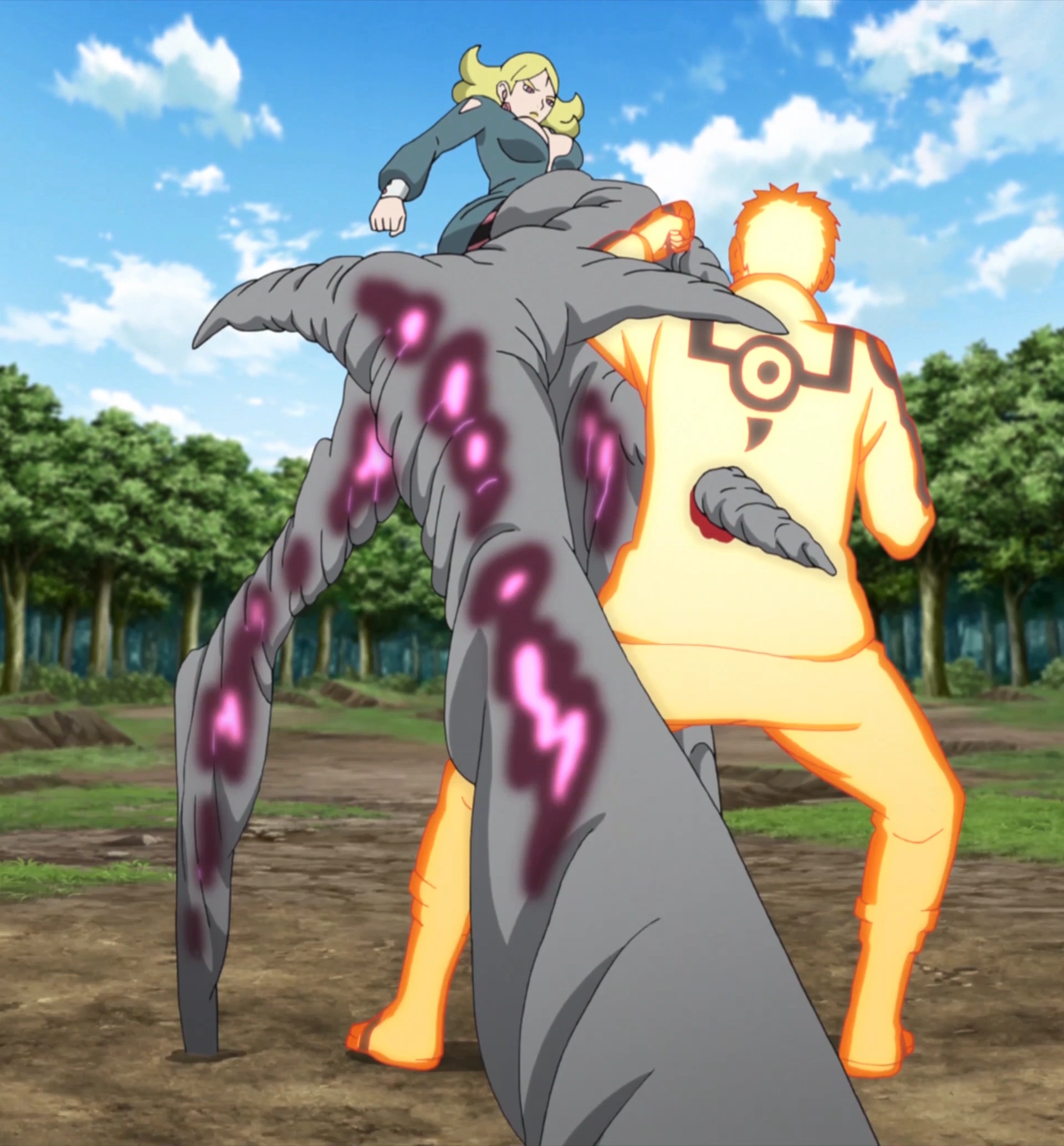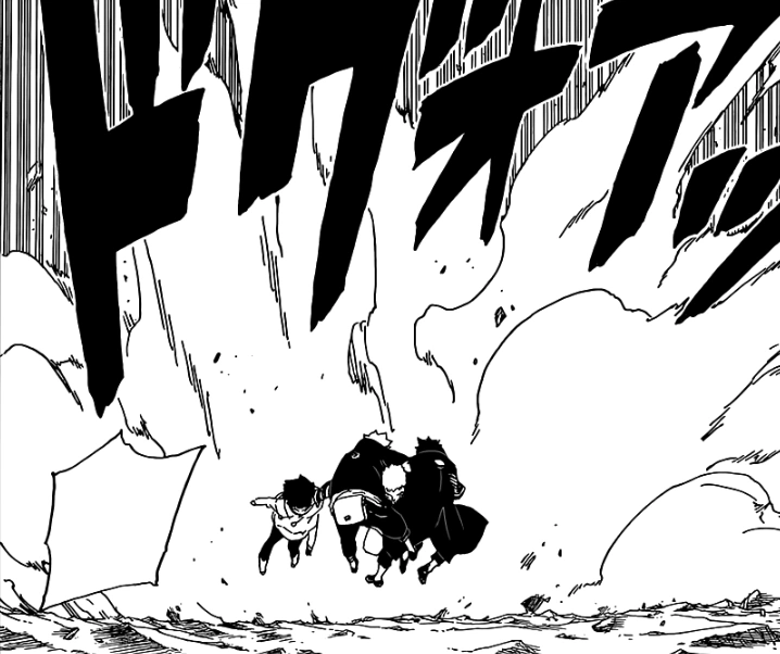 Como Naruto começa a desgastar sua inimiga gradualmente e ela percebendo que não poderia bater o Hokage neste ritmo, Delta desencadeou seu ás, um raio de olho destrutivo que anularia até mesmo o mais forte dos poderes regenerativos. Enquanto Naruto consegue se esquivar dos feixes letais, a atenção dividida permite que a Delta começasse a lançar mais golpes sólidos. Temendo pela segurança de seu pai, Boruto lança imprudentemente seu Rasengan Desaparecedor em Delta que rapidamente absorve o ataque para se reenergizar. Indo para uma nova tática, Delta lançou seu raio em Himawari, sabendo que ela iria inevitavelmente atingir alguém, seja seu alvo ou o Hokage atuando como um escudo humano para sua filha. Para surpresa de todos, no entanto, é Kawaki quem bloqueia a explosão, ao custo de seu braço direito. Independentemente disso, essa reviravolta de eventos a irrita.