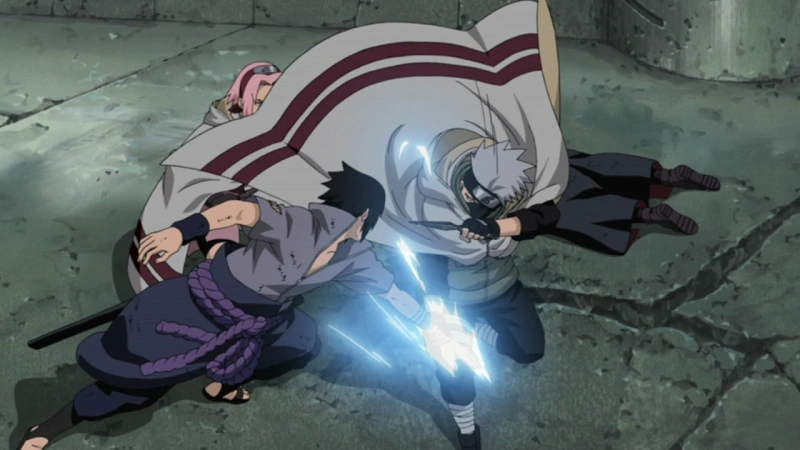 Kakashi atacando Itachi com o Raikiri.