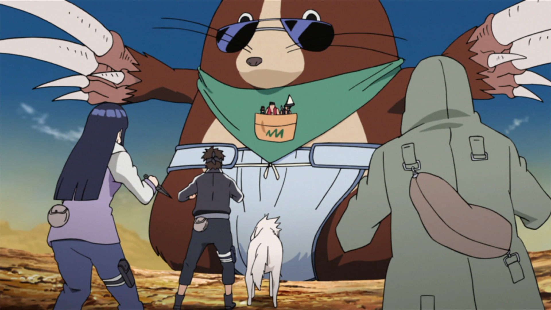 Muyami e seus companheiros de equipe fogem no Moguranmaru.
