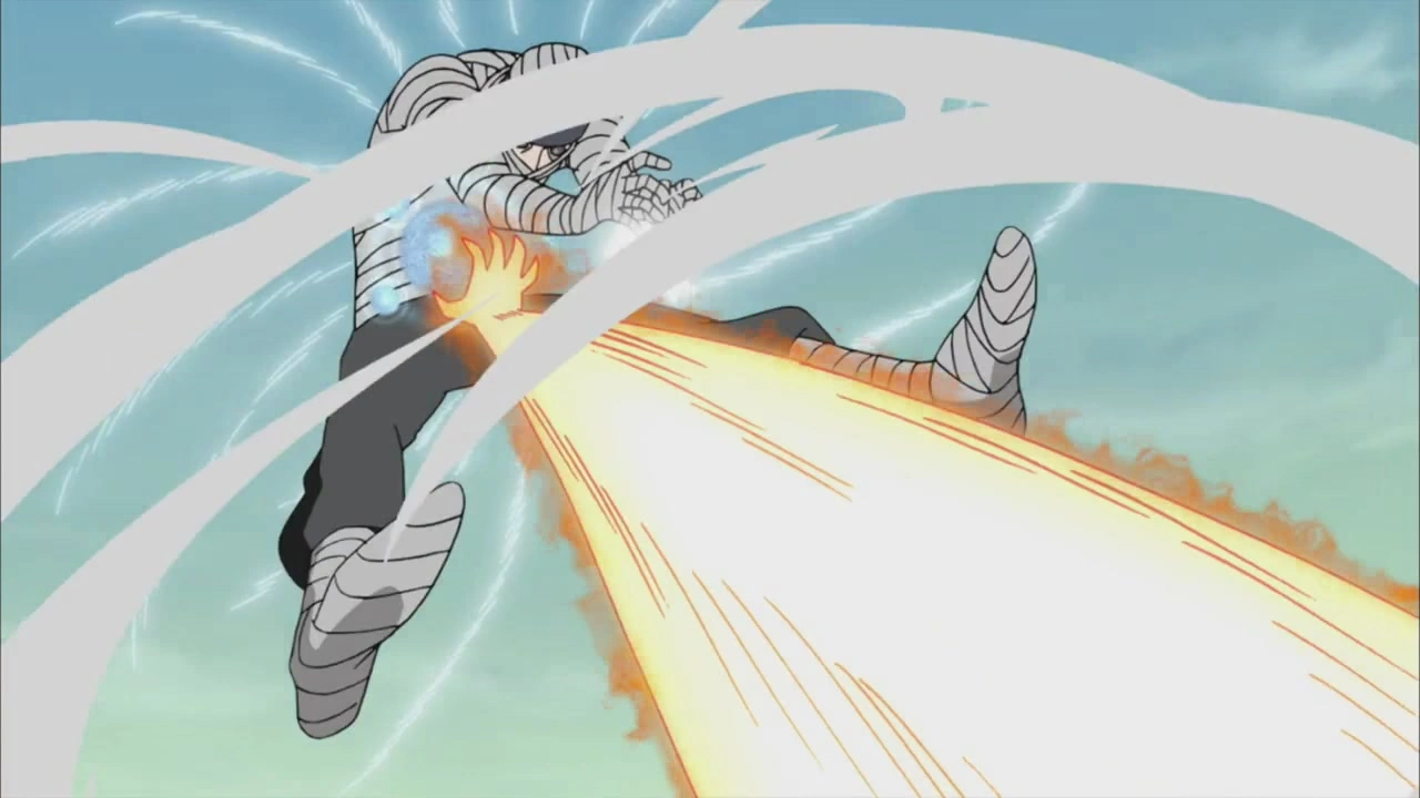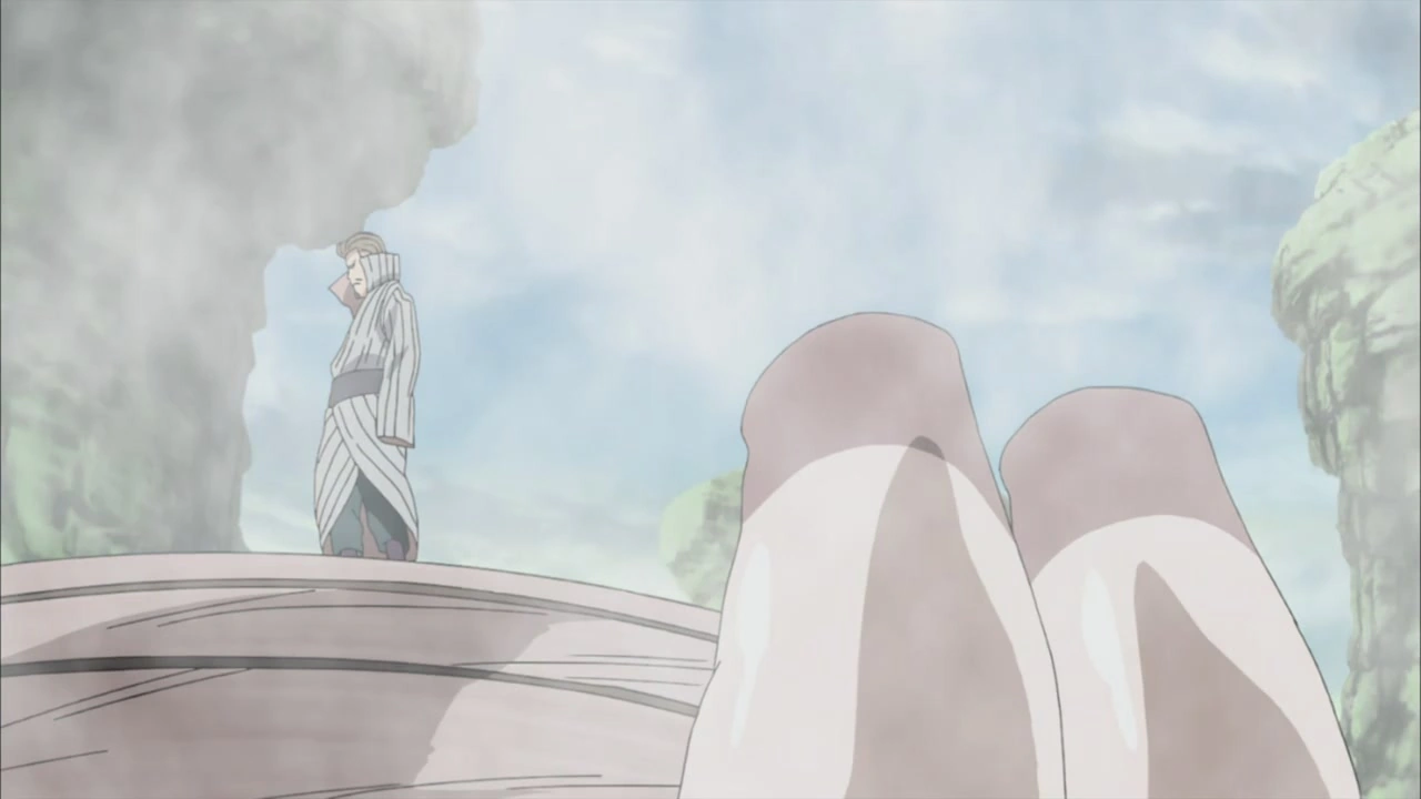 Gaara está selando Gengetsu e o Terceiro Raikage com areia na forma de sua mãe, mas eles escapam. Eles começam a atacar impiedosamente a Quarta Divisão. Enquanto isso, Oonoki e Mū simultaneamente atacam uns aos outros com o Estilo Pó: Técnica do Desprendimento do Mundo Primitivo. Mū diz para chamar Gaara para que ele use suas técnicas sensoriais, ou então o velho Oonoki irá morrer.