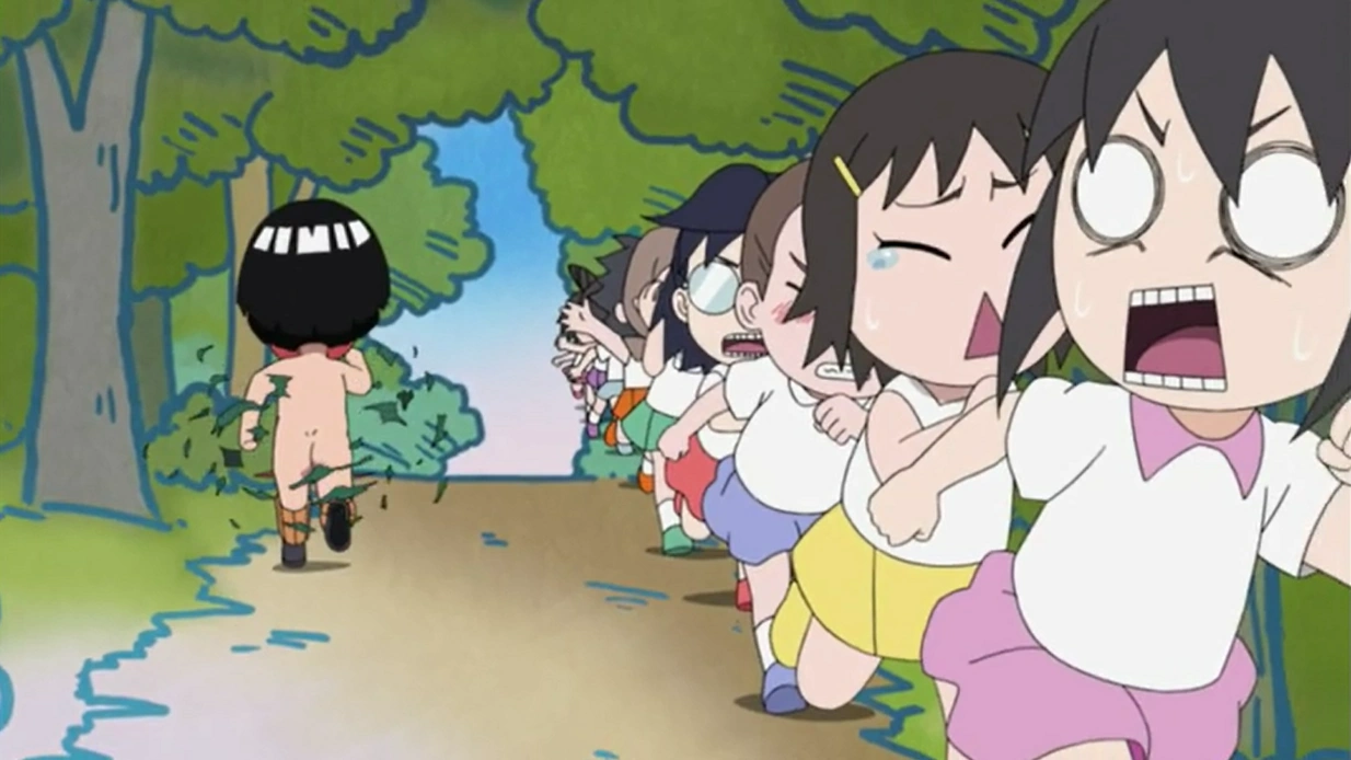 A roupa de Lee acaba encolhendo, o que o deixa incomodado, ele então observa que não tem nada para vestir. Tentando esticar a roupa, Lee diz que talvez se ele usar a antiga técnica de respiração ele poderá controlar a elasticidade de seus músculos, ele consegue entrar na roupa, mas ela fica muito apertada. Mais tarde, ele começa a correr na floresta e acaba se deparando com um grupo de meninas correndo na direção oposta, enquanto passam por ele a roupa de Lee acaba se rasgando, deixando-o nu na frente das garotas, as quais gritam ao ver a cena.
