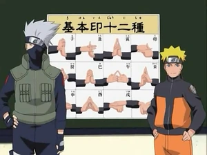 Kakashi explica que o mais indispensável para uma técnica são os selos de mão e há também algumas técnicas especiais que não necessitam de selos. Kakashi diz que há uma combinação de selos básicos, os quais Naruto mostra sendo esses: Rato, Boi, Tigre, Coelho, Dragão, Cobra, Cavalo, Carneiro, Macaco, Pássaro, Cão e Porco. Kakashi pede a Naruto que faça a Técnica de Clonagem e ele utiliza os selos Cabra, Serpente e Tigre e ao terminar a técnica dá errado.