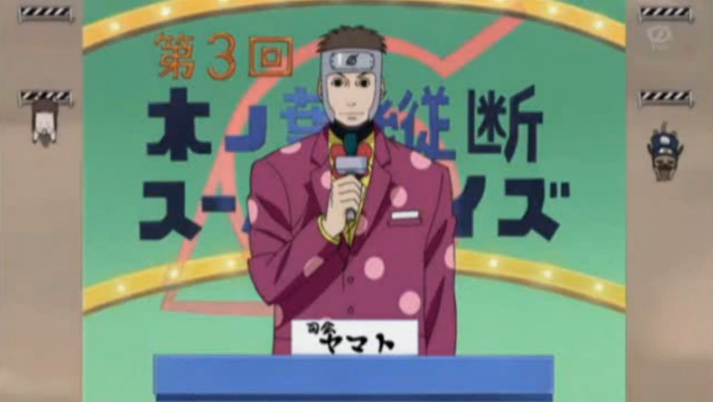 Yamato apresenta o terceiro concurso de perguntas. Desta vez, os participantes são Naruto, Sakura, Shikamaru e Chouji, Naruto e Sakura estão muito animados enquanto Shikamaru está entediado e Chouji comendo. Yamato lhes diz que neste momento, se eles não responderem corretamente às perguntas eles serão punidos, começando a falar sobre o trio Ino–Shika–Chou, ele começa com Inoichi, mas é interrompido por Sakura que acredita que sabe a resposta, ele continua com Shikaku desta vez, mas ele é interrompido por Shikamaru, ele então muda para Chouza, no entanto, Chouji o interrompe também. Yamato então pergunta sobre o jutsu que Jiraiya usou durante o ataque a Konoha por Orochimaru, mas ninguém sabe a resposta, sendo ela a Invocação: Técnica da Casa Caiu. Como eles não responderam, eles são esmagados por um sapo de pelúcia gigante como punição.