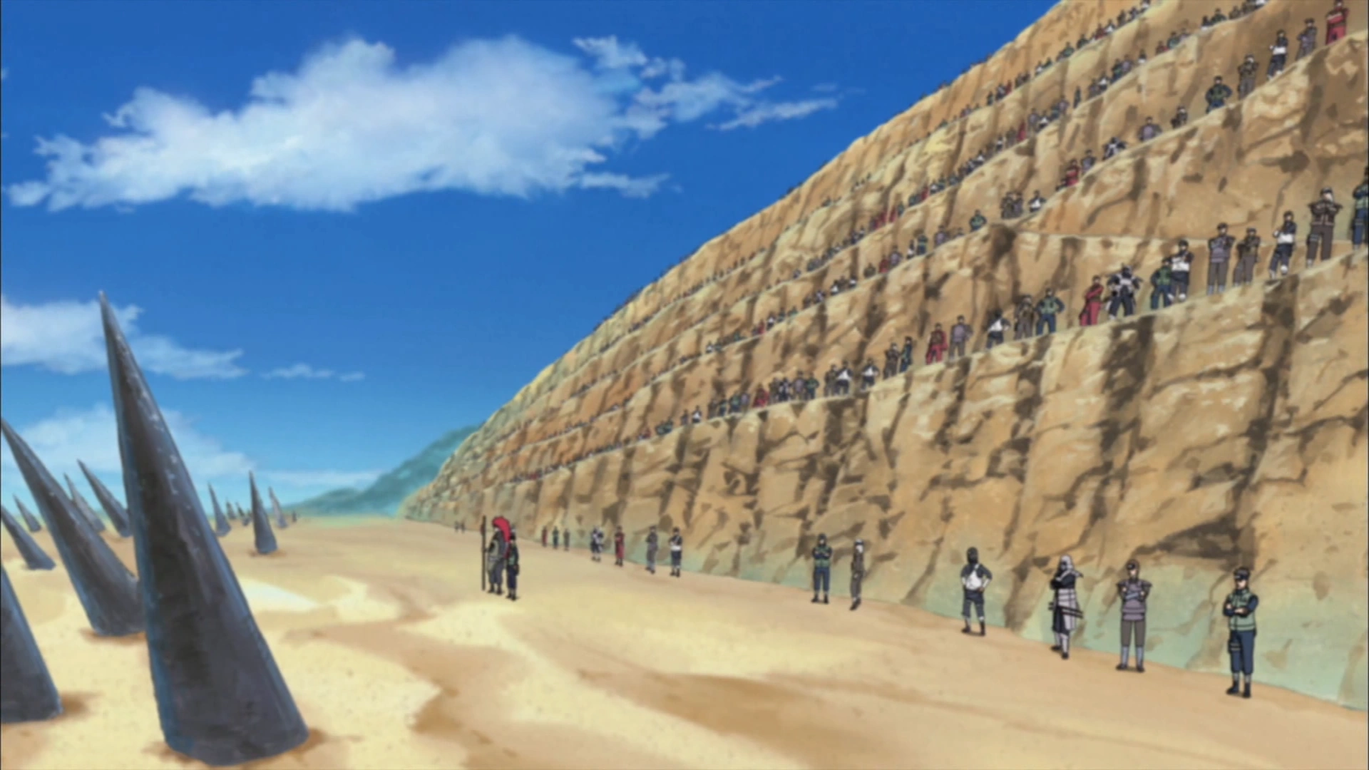 Quando a noite se aproxima, Tobi aparece no campo de batalha e invoca a Estátua Demoníaca do Caminho Exterior. Chouji e Chouza unem forças contra ele, mas eles são facilmente arremessados para longe, no processo matando muitos shinobi. No caos que se segue o confinamento de Dan é destruído, mas a equipe de selamento é capaz de neutralizar Kakuzu. Enquanto a Estátua devasta o campo de batalha, Tobi leva a Benihisago e o Kohaku no Jōhei. Darui e Shikamaru supõem que ele planeja usar o chakra da raposa demônio dos Irmãos Ouro e Prata e tentam impedi-lo. A Estátua ataca os dois, dando a Tobi a chance de escapar. Ele leva a Estátua com ele. Ao cair da noite as forças recuam.