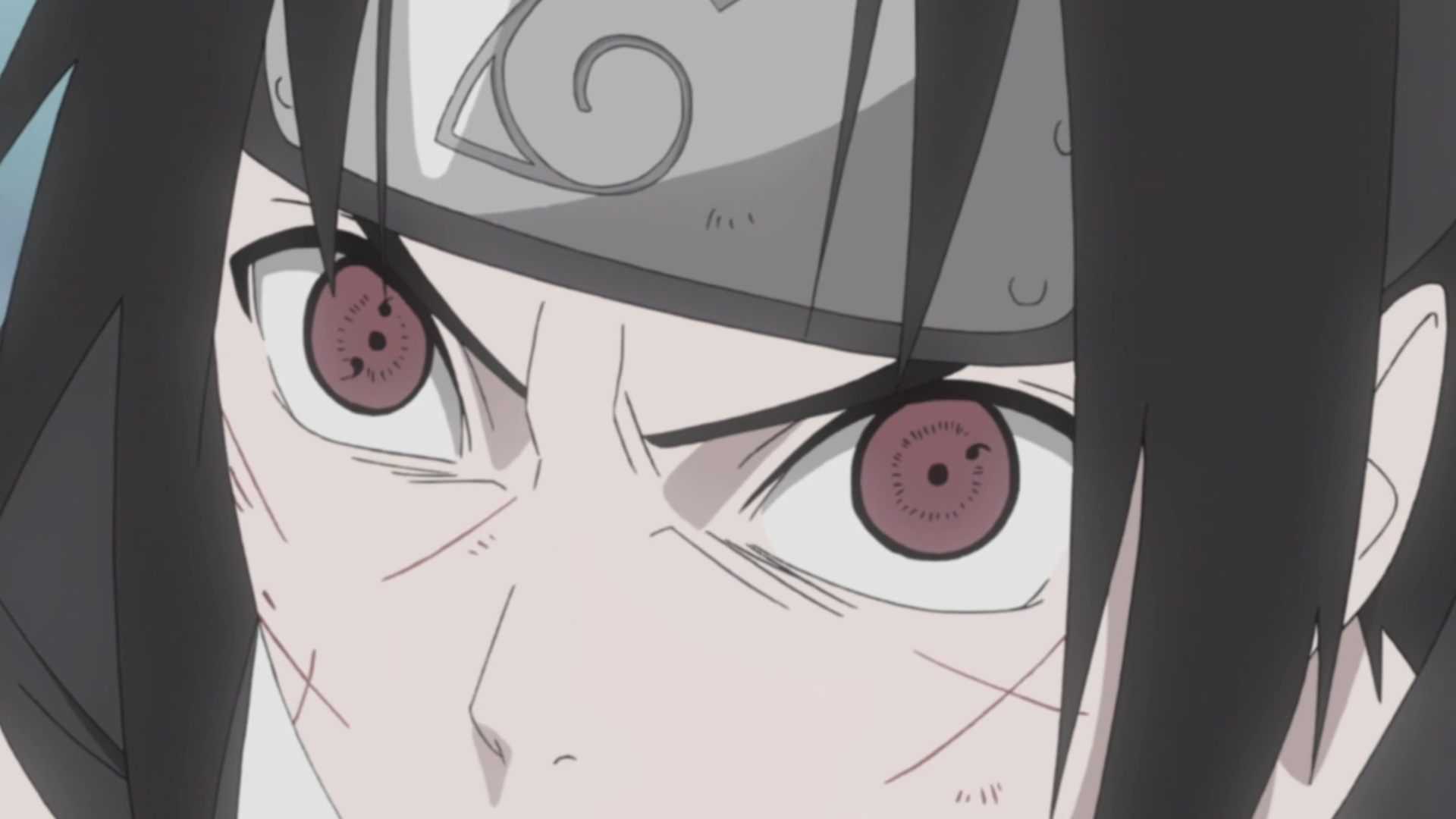 Sasuke com o estágio primário (direita) e secundário (esquerda) do Sharingan.