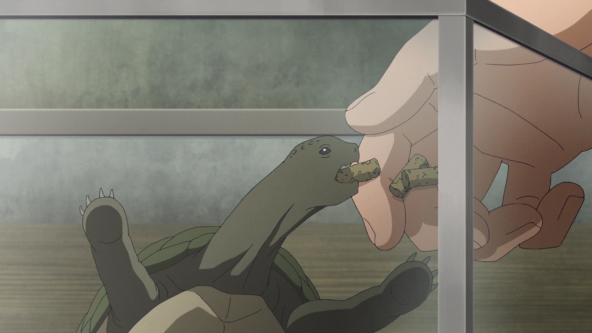 Konohamaru alimentando a tartaruga.
