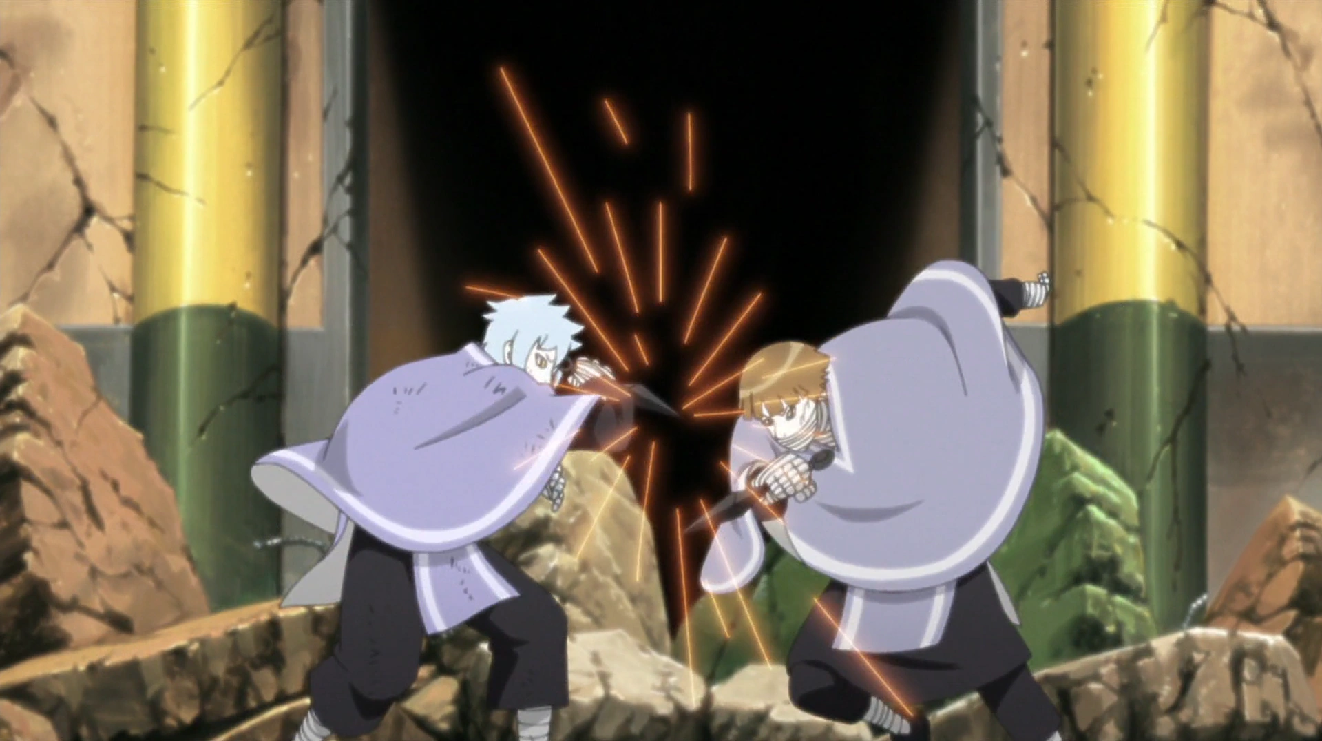 Din cauza daunelor provocate de Mitsuki corpului lui Kū începe să se descompună. Kū pleacă pentru a primi îngrijiri medicale, dar Sekiei îl împiedică pe Boruto să-l urmeze cu Argila Explozivă. Mitsuki vrea ca Boruto și Sarada să meargă după Kū în timp ce se ocupă de Sekiei, care este furios pe el. Kirara îi blochează pe Boruto și Sarada cu Akuta. Mitsuki încearcă să-l descurajeze pe Sekiei să lupte, astfel încât corpul său să nu se descompună. Sekiei îl atacă pe Mitsuki, în timp ce-l acuză că pretinde că este prietenul lui. Boruto și Sarada distrug câțiva din Akuta lui Kirara, al cărui corp începe să se descompună. Kirara crează un monstru uriaș din Akuta pentru ai ucide pe Boruto și Sarada. Boruto îl invocă pe Garaga să-i ajute. Sarada se îndreaptă spre Kirara, reușind să o prindă în genjutsu, oferindu-i o deschidere pentru un atac cu Sfera de Fulger. Kirara îi ordonă uriașului Akuta să o salveze, dar Garaga îl strânge până îl zdrobește, una dintre bucățile sale zdrobind-o pe Kirara.