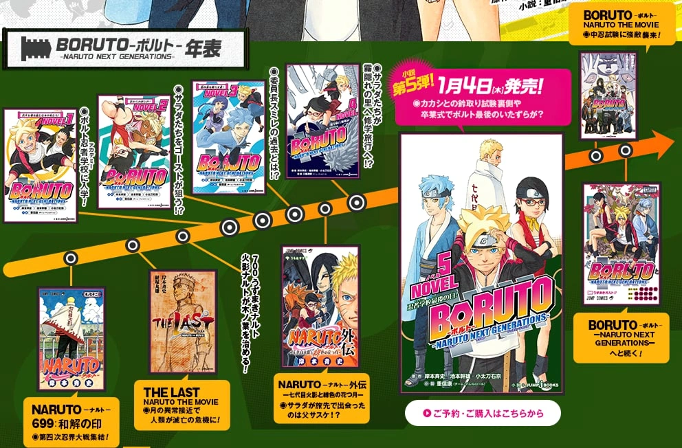 Текущая хронологическая последовательность новелл Боруто: Новое Поколение Наруто.[12]