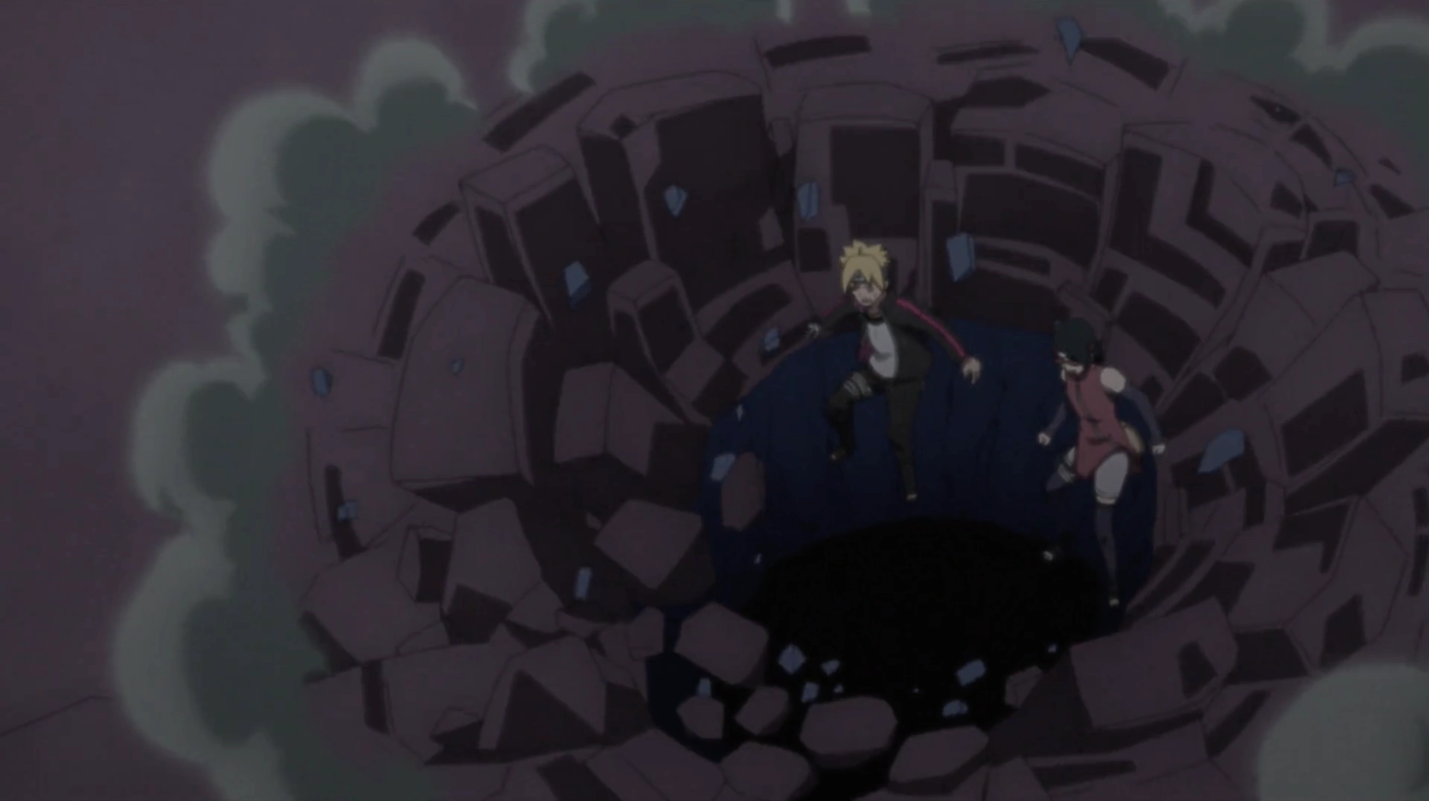 Позже, Боруто вместе с Мицуки бежит домой, когда его Кама по какой-то причине активируется, предчувствуя что с Каваки случилось что-то плохое. Он ещё больше забеспокоился, когда его метка вновь отступила. Когда Боруто и Мицуки прибыли, спросив что случилось, Каваки объяснил им, что Джиген внезапно появился и забрал Наруто. Неожиданно Каваки оказывается под действием Техники Теневого Подражания Шикамару. Открыто выразив своё недоверие к Каваки, Шикамару приказывает команде ниндзя создать барьер вокруг территории, пока он будет допрашивать Каваки. В то время как Боруто ручался за него, Каваки не сопротивлялся растущему недоверию Шикамару. После этого, Каваки замечает, что его протез руки реагирует, что означало то, что Наруто жив. Синхронизировав свою Каму с Камой Боруто, они создают разлом в пространстве. Шикамару отказывался позволить кому-либо войти в появившийся портал, и Каваки использовал Каму, что сбежать из техники Шикамару, и тогда генины вошли в разлом, что ведёт к местоположению Наруто. Там, они встречают Боро, который охраняет контейнер с запечатанным внутри Наруто. Когда они вступают с ним в бой, Боро выдерживает атаки Команды 7, благодаря своей мгновенной регенерации и подверг их воздействию Тёмного Тумана, что лишило их сил. Пока враг планировал отвести Боруто вместе с Каваки обратно в Кару, совместные усилия Мицуки и Сарады дали возможность команде отступить. После того, как Мицуки попросил Сараду проанализировать туман Боро её Шаринганом, что показал ей его вирусную природу, Сарада была выбрана лидером команды и возглавила их контратаку. Когда она нанесла первый удар, следующими напали Каваки и Боруто, выздоровши от вируса, уничтожив голову Боро и верхнюю часть его тела.