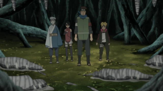 Боруто, Шикадай и Мицуки сталкиваются с одержимым Шино.
