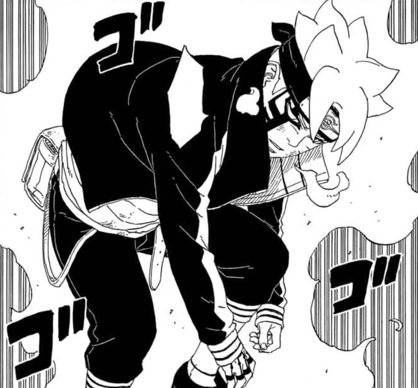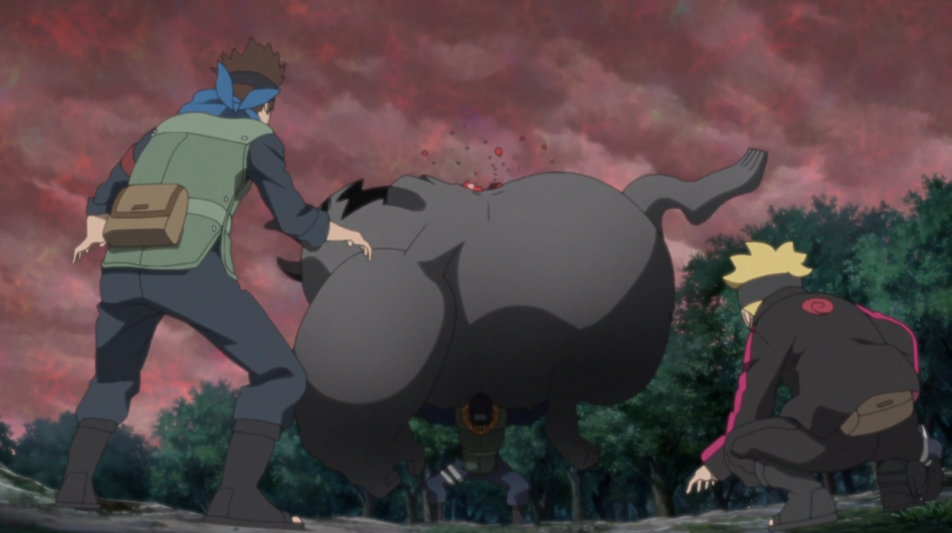 После регенерации этих частей, Боруто и Мицуки продолжили сражаться с Боро, помогая Каваки, лишь для набора большего количества регенераций врага. Когда опять Каваки присоединился к битве, отразив контратаку Боро, направленную на уставших детей, и Сарада наконец сделала свой ход. Узнав от Каваки о безграничной регенерации Боро, требующей наличия специального ядра в его теле, она нанесла удар по нему своим Чидори. Успешно уничтожив ядро, тело Боро начало мутировать без своего стабилизатора. С помощью Каваки, Боруто использовал свою Каму, создав разлом в печати и освободив бессознательного Наруто. Когда дети проверяли состояние Хокаге, Боро собрался со своими силами, атаковал Мицуки. Остальные были быстро повержены массивной формой Боро, и Кама Боруто прогрессировала дальше, проявив волю и личность Момошики, что также продемонстрировало огромный прирост силы, чтобы победить Боро. Взяв под полный контроль тело Боруто, Момошики убил Боро гигантским Расенганом. Когда его Кама деактивировалась, Момошики предупредил Боруто, что ещё не пришло время, когда он должен потерять всё, оставив Боруто без сознания, и он упал, всё это время находясь в воздухе. Его поймал Мицуки и проверил его, и после своего пробуждения Боруто не смог ничего вспомнить о проявлении Момошики.