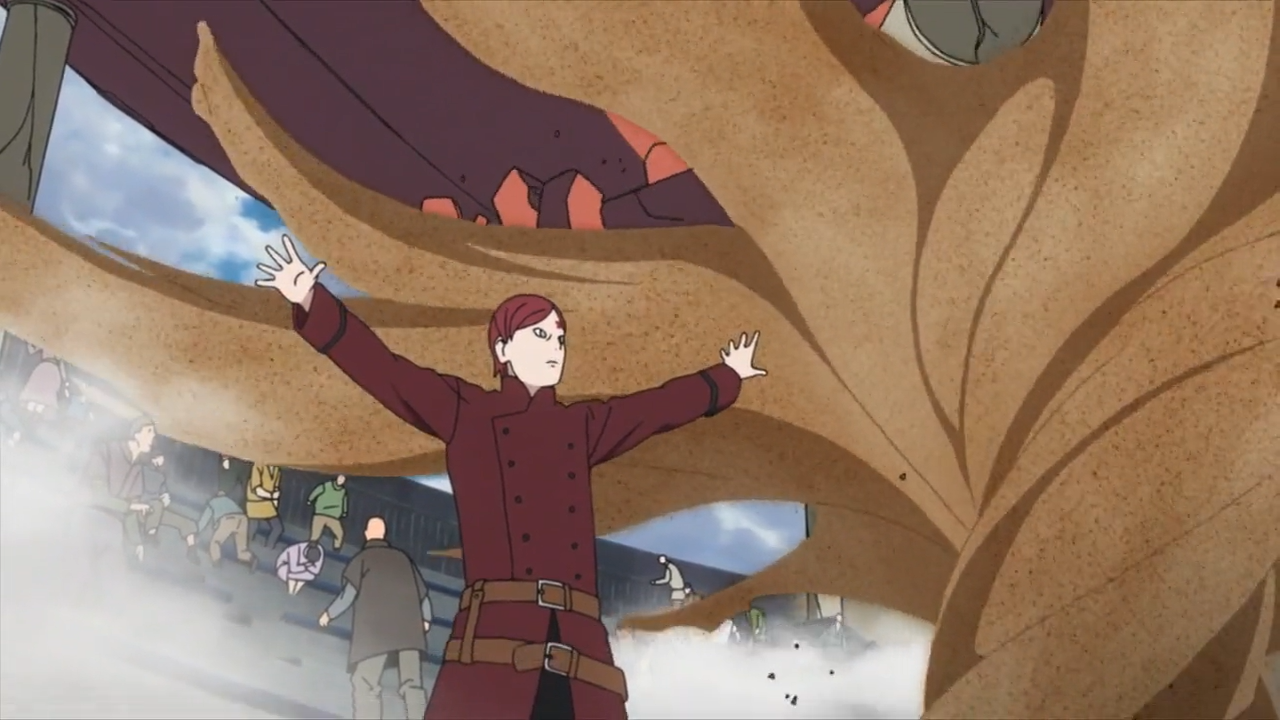 В аниме Гаара получает сообщение о том, что Коноха была разрушена во время нападения Акацуки. Гаара уверен, что они смогут восстановить деревню, так как у них есть Наруто, и вспоминает, как команда 7 помогла ему разобраться с капитаном Ассасинов Песка.
