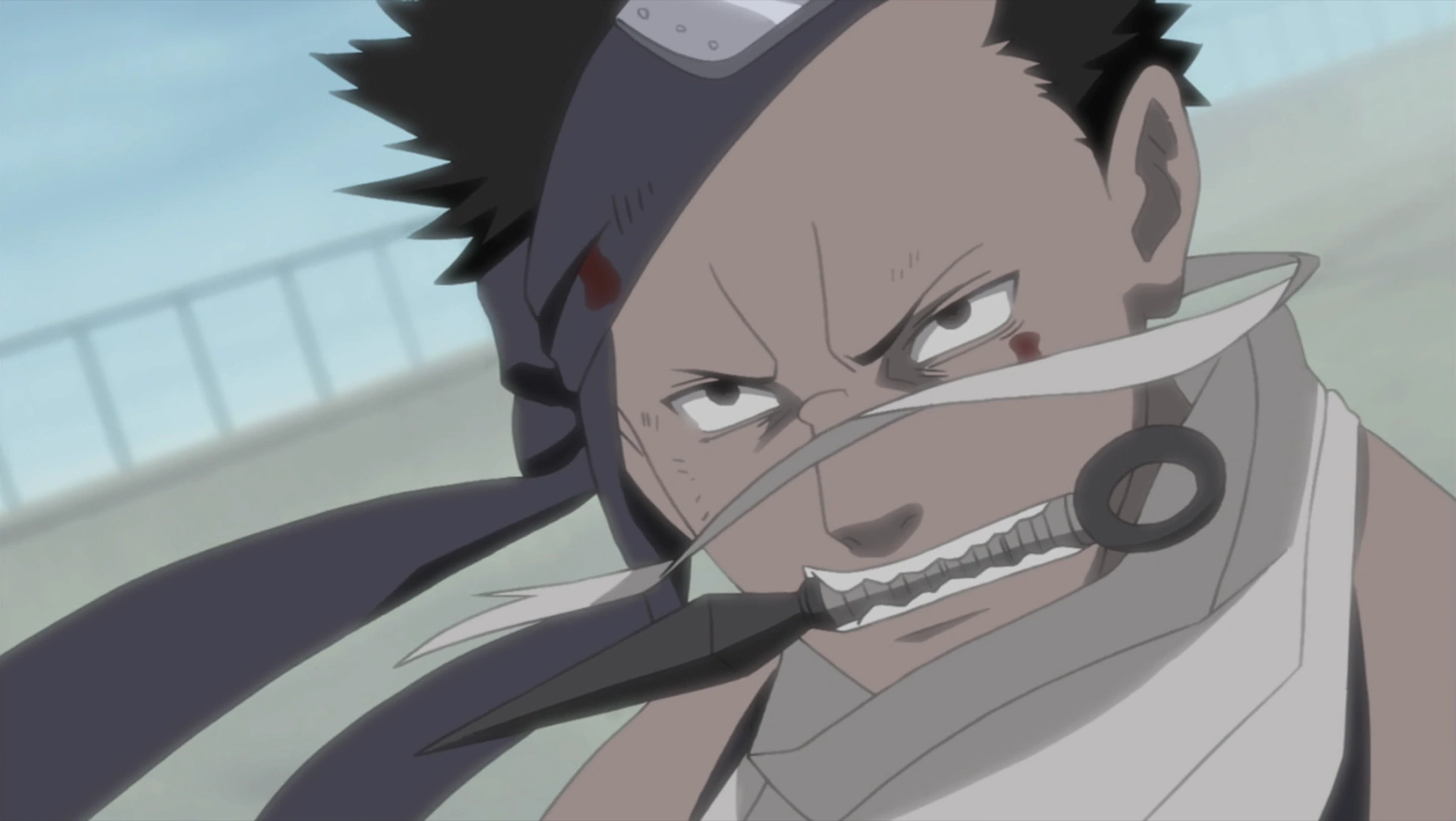 Даже серьезно раненый, Забуза продолжает сражаться одним лишь кунаем во рту.