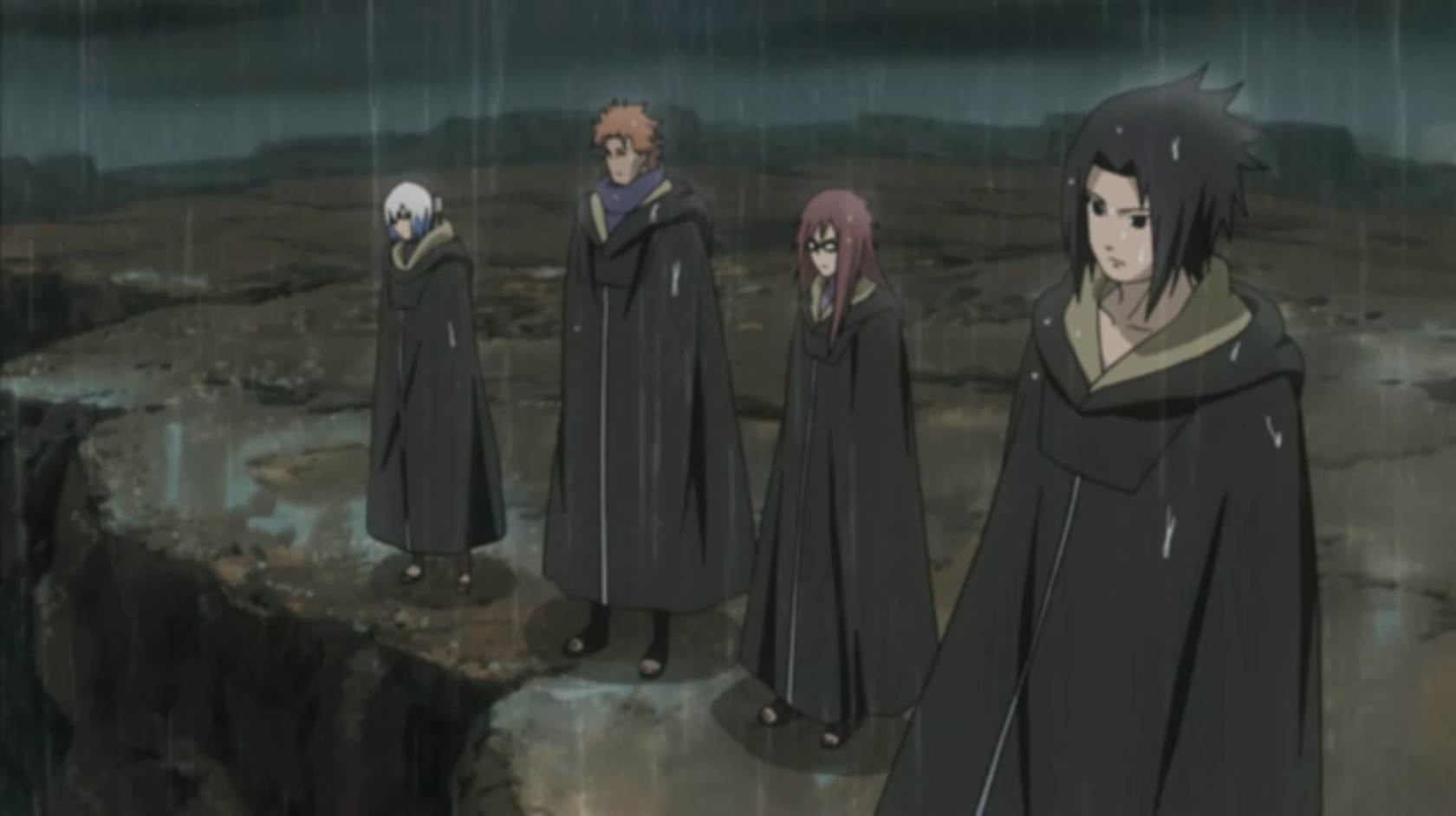 Заметив взрыв, команда Наруто направилась к его источнику, а Киба учуял запах Саске. В это время Саске расспрашивал остальных членов Хеби, что они узнали об Итачи. Суйгецу и Карин не выяснили ничего, а Джуго общался с птицами, которые могли почувствовать чакру Акацуки, исходящую из их убежища, которое он отметил на карте. Они решили наведаться в последнее используемое убежище, чтобы найти Итачи. Тем временем, Итачи направлялся в убежище Учиха и отправил двух клонов: одного, чтобы найти Наруто, а второго — найти Саске.