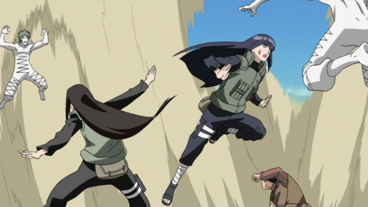 Обойдя ловушки, отряд Шикамару, благодаря бьякугану Неджи, находит Четвёрку Звука, отдыхающую после битвы с джоунинами Конохи. Неджи и Шикамару прячутся в кустах, планируя атаку. Но противники замечают их и подрывают обоих взрывной печатью. Наруто, Киба и Чоджи также оказываются схваченными. Один из Четвёрки, Джиробо, остаётся для расправы над командой Шикамару, а остальные трое продолжают путь. Джиробо ловит всех в свою технику и начинает поглощать их чакру. Вскоре, благодаря плану Шикамару, вся команда выбирается из ловушки, а Чоуджи остаётся для битвы с Джиробо. Остальные четверо вновь отправляются в погоню. Команда догоняет оставшуюся тройку. Вновь один из них, шестирукий Кидомару, отправляет остальных дальше к Орочимару, а сам остаётся для сражения с командой Шикамару. Он начинает использовать паутину, и все четверо попадают в неё, а из Неджи Кидомару делает кокон. Но пойманные в сеть клоны Наруто оказываются все таковыми, а настоящий атакует Кидомару из-за спины, но безуспешно. Кидомару пускает паутину на Наруто, но её режет Неджи и спасает Наруто. Ниндзя Звука удивлён, ведь никому не удавалось резать его паутину. Киба говорит, что Кидомару намного сильнее Джиробо. Неджи просит остальных идти за Саске, а сам остается для расправы с Кидомару. Перед этим Неджи говорит Наруто, что его глаза лучше и, что лишь он сможет спасти Саске от тьмы. Друзья желают ему удачи и отправляются дальше за Саске. Кидомару, не желая отпускать их, пускает паутину, но Неджи останавливает её действие. Начинается бой: Неджи против Кидомару.