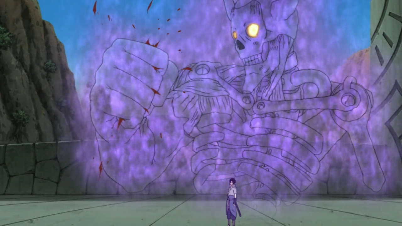 Огромная физическая сила а позволяет Райкаге сломать Кубикирибочо Суйгецу пополам и отбиться от полностью трансформировавшегося Джуго. Против основанной на молнии техники Эя, которая способна свести на нет даже Чидори, Саске использует свой Мангекьё Шаринган, активируя неполное Сусаноо и Аматерасу для собственной защиты. Эй пробивает эту защиту ценой своей руки. Прежде, чем Райкаге наносит себе больший вред, вмешивается Гаара, желая поговорить с Саске.
