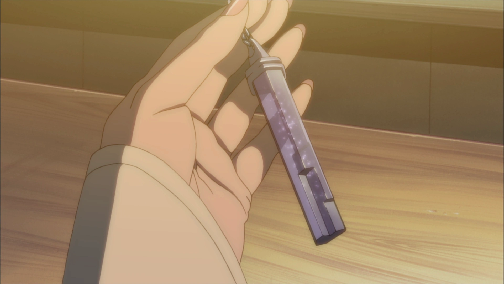Исходя из названия, это шестигранный продолговатый кристалл фиолетового цвета с отступом внизу. На верхней части имеется крючок с веревкой, благодаря чему его можно носить как ожерелье.