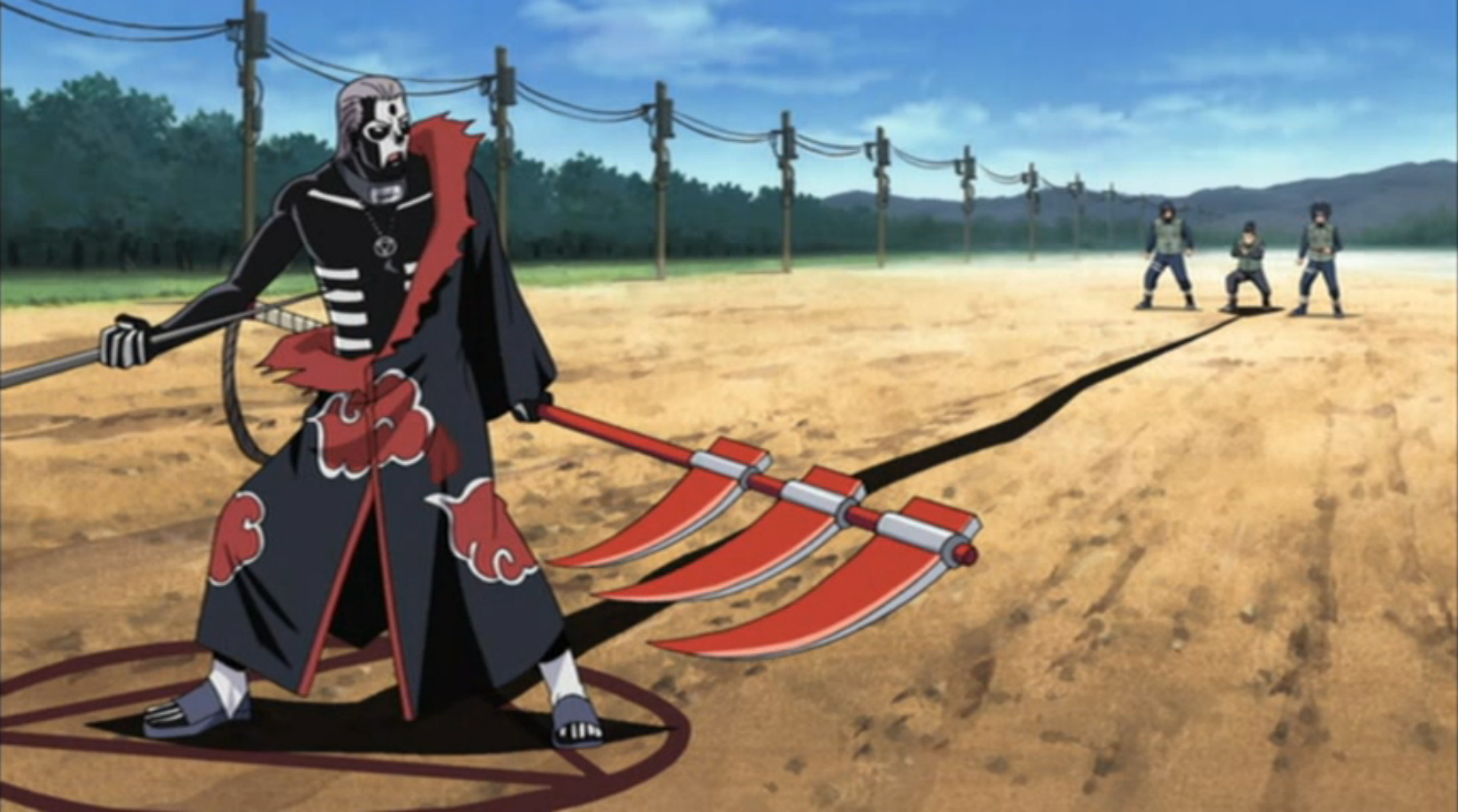 В скором времени они обнаруживают Хидана, ожидающего снаружи пункта для обмена. Асума отвлекает его, пока Шикамару успешно ловит его своей тенью, позволяя Изумо Камизуки и Котецу Хагане ударить его своими мечами. К их удивлению, Хидан переживает их атаку. Затем появляется партнер Хидана Какузу, который атакует Шикамару, заставляя отпустить Хидана. Их взвод перегруппировывается, и Асума просит Шикамару попытаться сдержать Хидана с помощью его технике теневых игл, пока он сражается с ним, планируя обезглавить его, как только он будет захвачен. Хидан уклоняется от тени Шикамару и ударов Асумы, при этом умудряясь поцарапать щеку Асумы своей косой. После этого он слизывает его кровь и чертит кровавый символ, с помощью которого связывает их с Асумой тела.