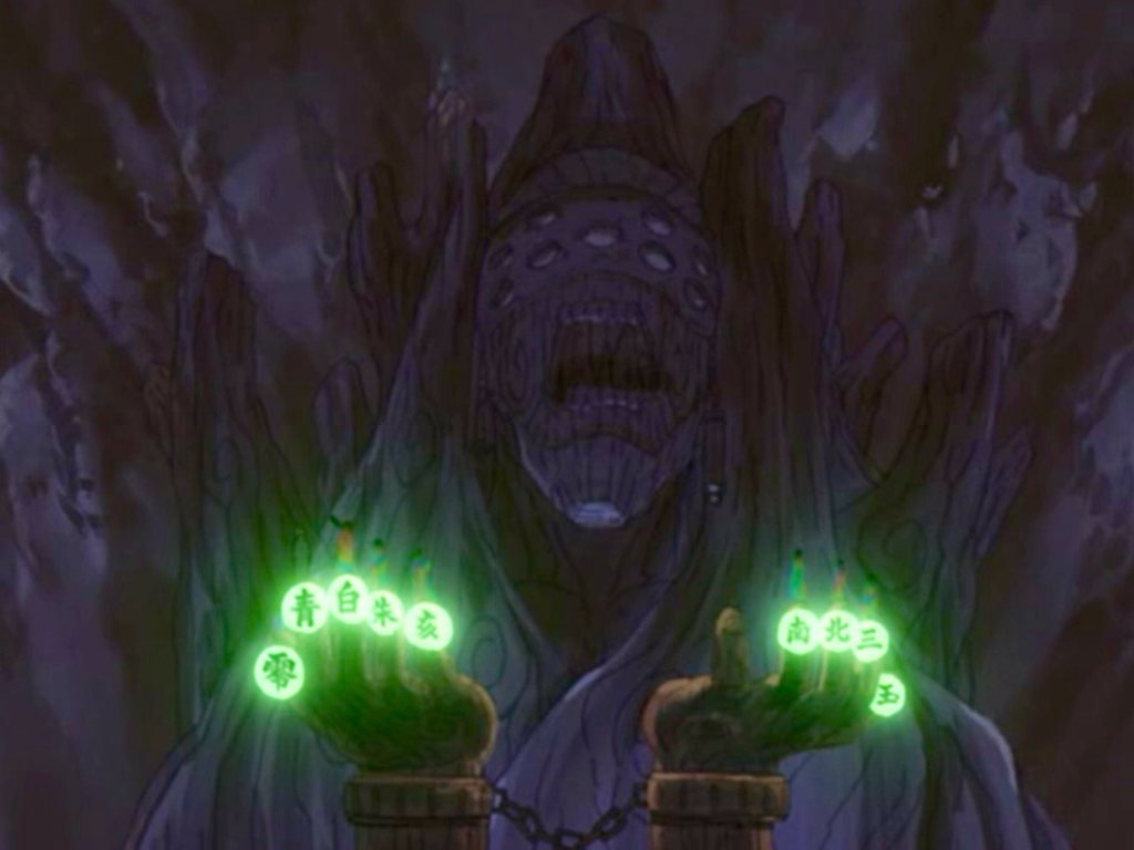 - Left middle finger: "north" (北, hoku); worn by Kakuzu. Its colour is dark green.