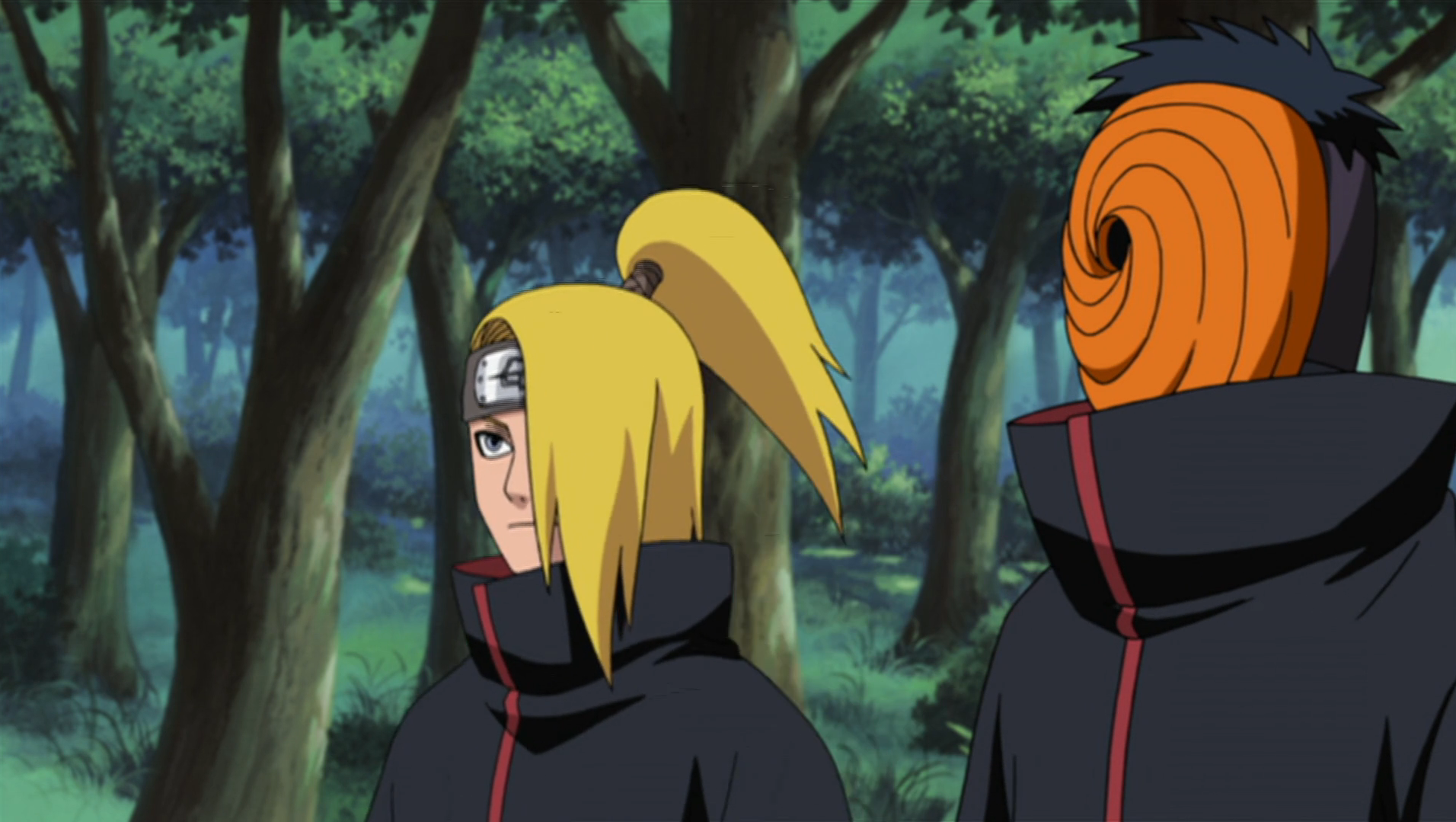 When Tobi replaces Sasori in Akatsuki he also becomes Deidara's new partner. Per the persona he assumes, Tobi regularly annoys Deidara, either through open disrespect or out of apparent ignorance. Deidara attempts to kill Tobi several times out of irritation, but never manages to succeed, or at least follow through. Deidara, unaware of Tobi's true identity, takes him on as a sort of disciple, instructing him on the ways of the world and how to succeed in Akatsuki. Deidara even displays a certain fondness for Tobi at the end of his life, instructing him to get to a safe distance from his C4 and then apologising for what he assumes will be Tobi's death prior to using C0.